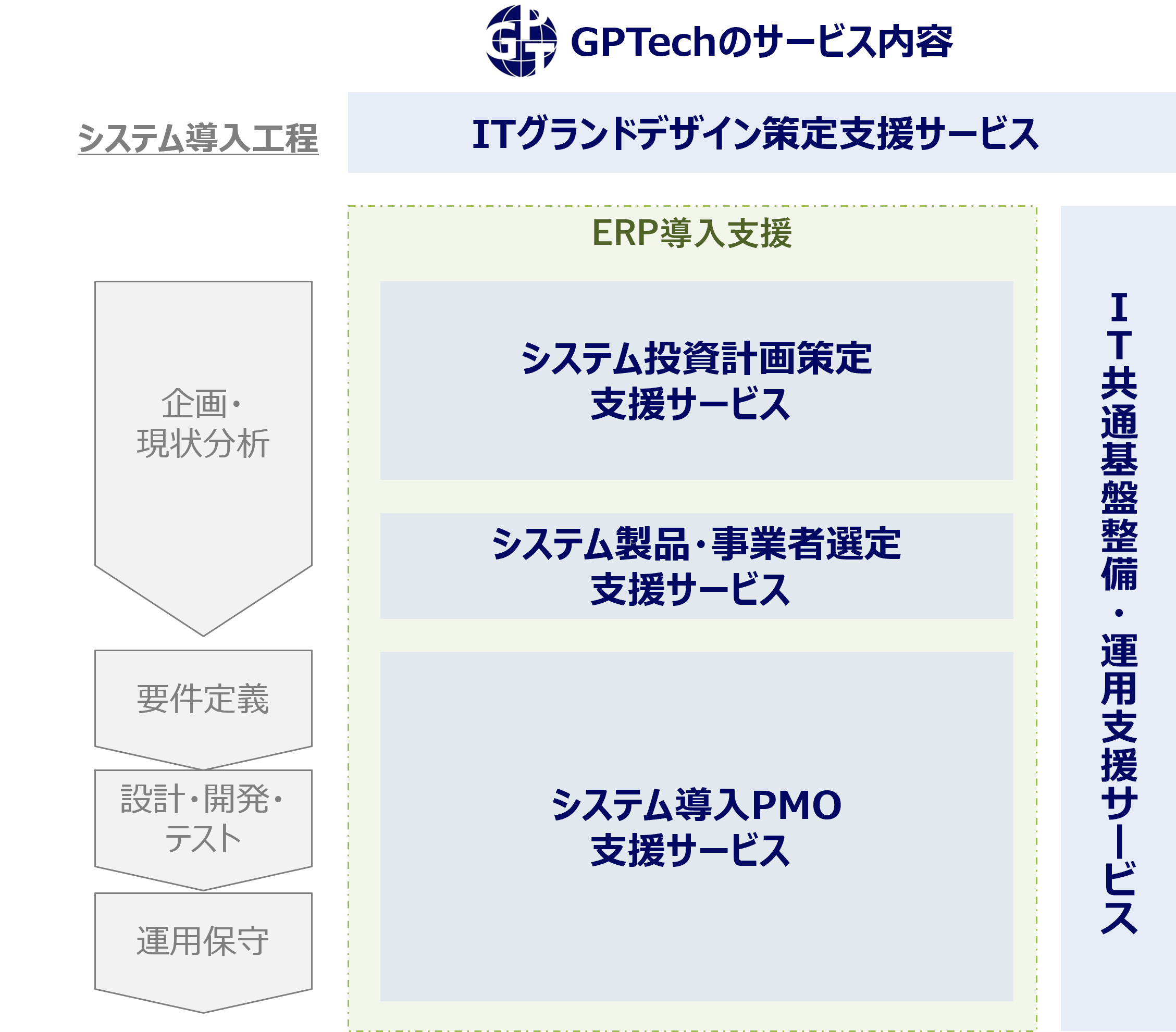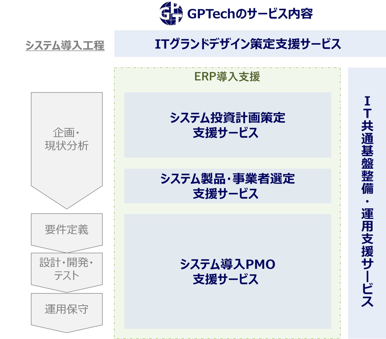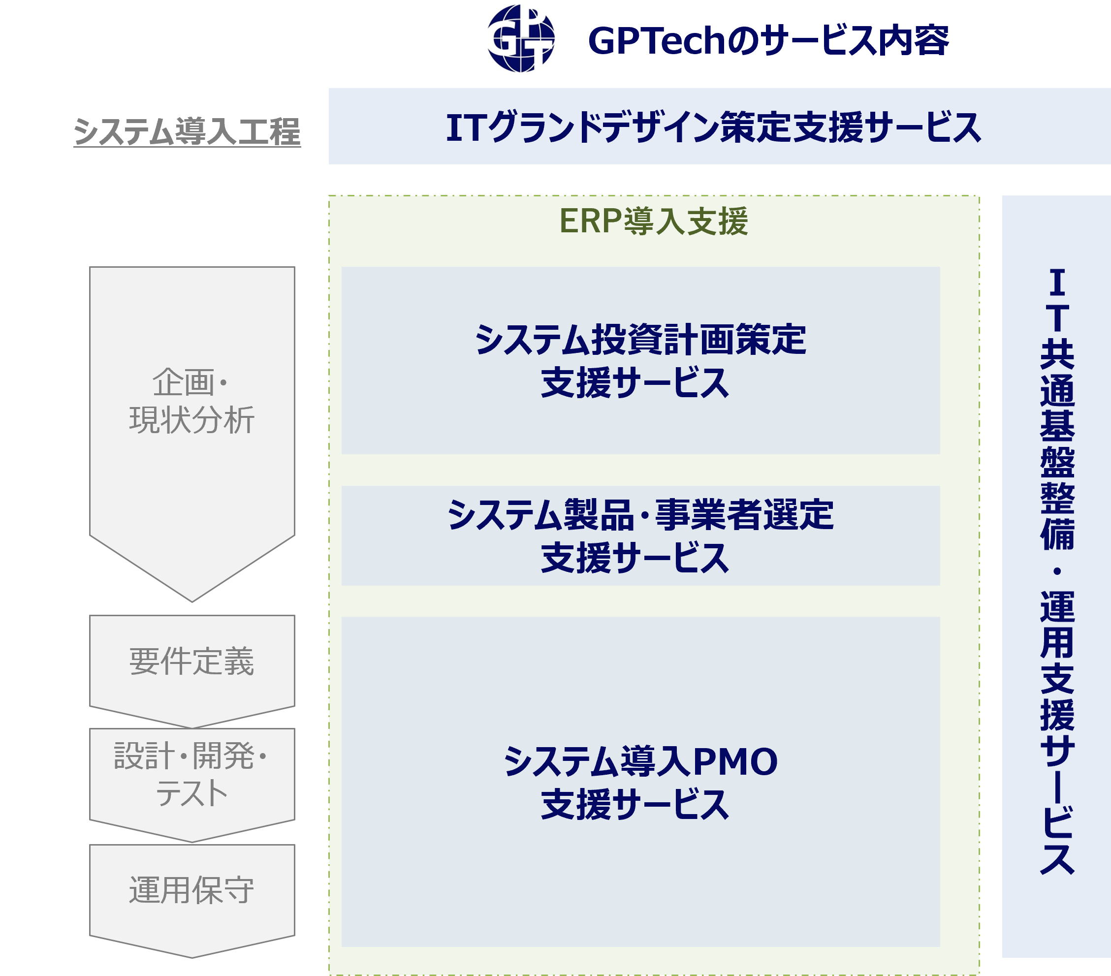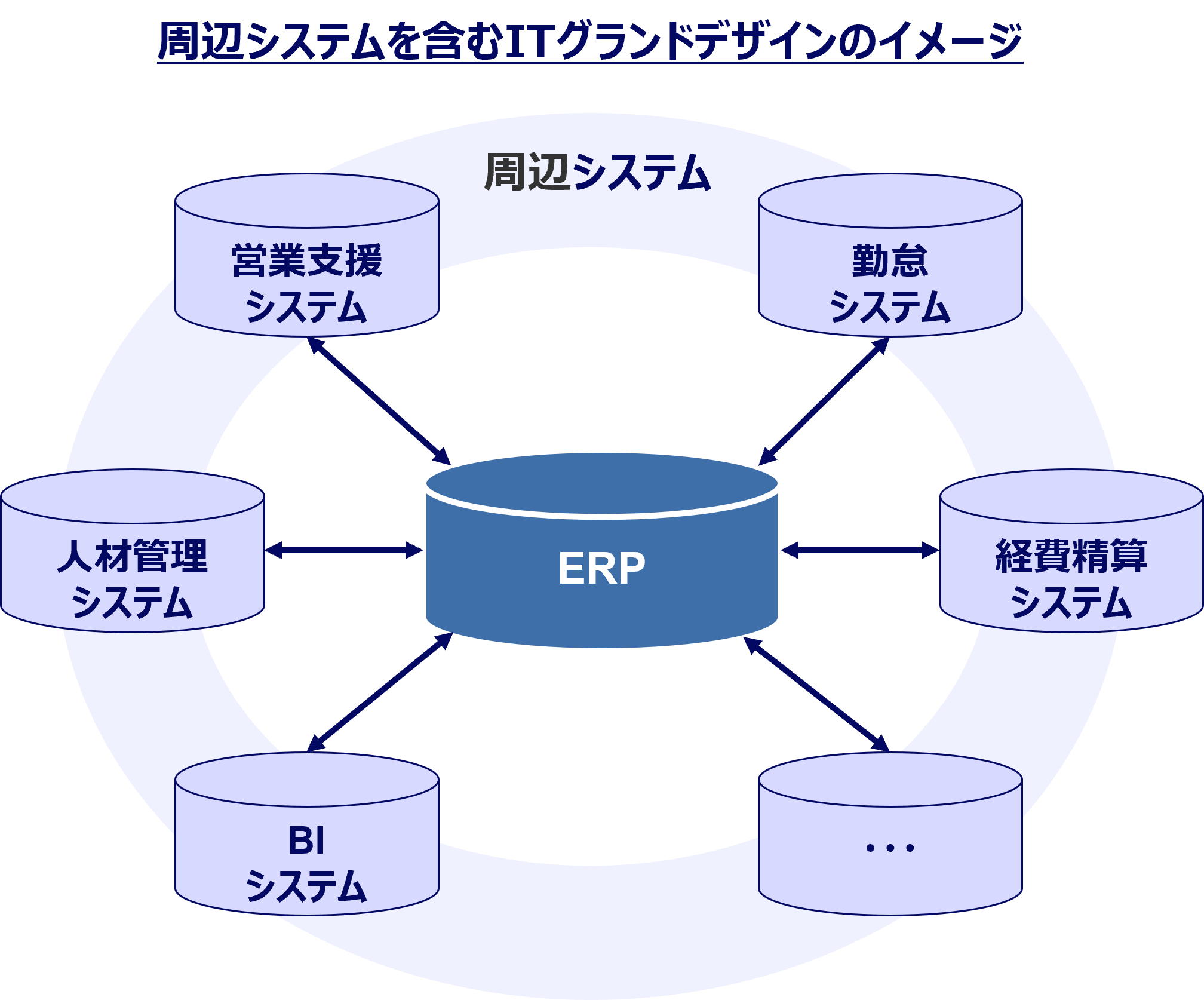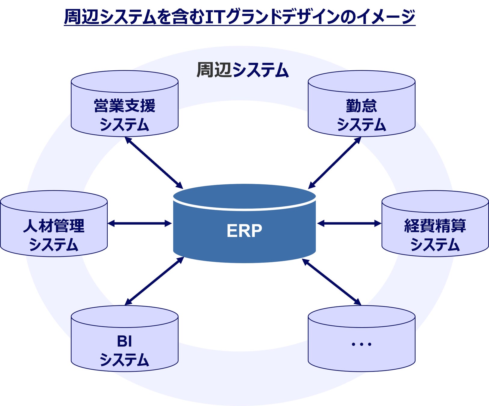 GPTechは、ERPシステム導入に際して、周辺システムとの連携やIT共通基盤整備なども含めたユーザー企業のシステム全体のグランドデザインを描いた上でERP導入を支援します。(下図、「周辺システムを含むITグランドデザインのイメージ」参照)