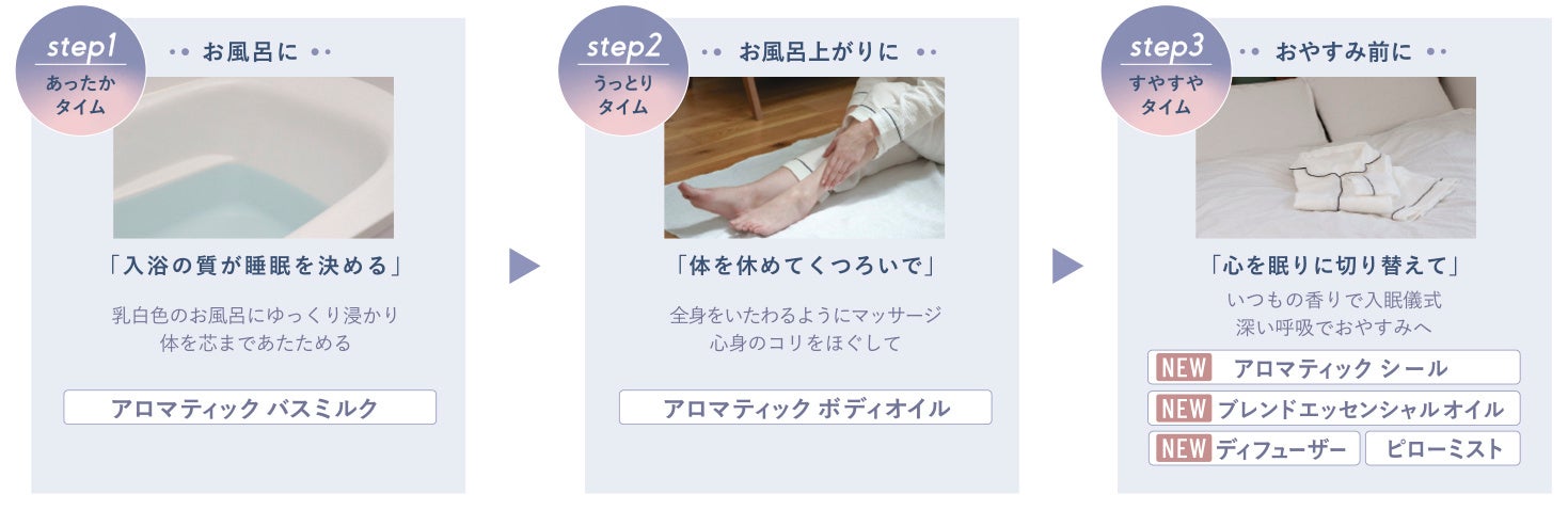 2022年5月17日には、第一弾として「アロマティックバスミルク・ボディオイル・ピローミスト」の3アイテムがそれぞれ2つの香りでデビュー。専任のアロマセラピストが時間をかけて調合した香りは、幸福感あふれる眠りへの時間をもたらすと大変好評で、“テストする女性誌” LDK(エルディーケー)でもA評価を獲得しています。