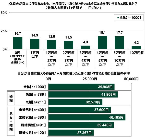 - お小遣いを使いすぎたと感じる金額は平均39,908円/月、女性では婚姻状況で19,098円と大きな金額差