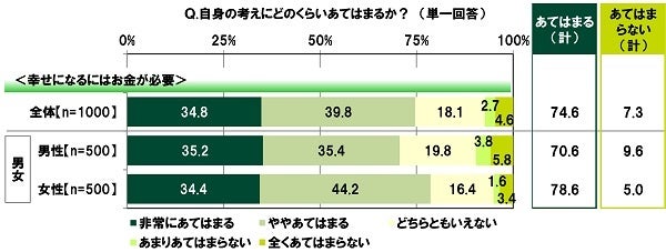 さらに、お金と幸せの関係についての意識を聞いたところ、<幸せになるにはお金が必要>では『あてはまる(計)』は74.6%となりました。