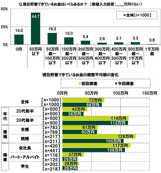 前回の調査結果と比較すると、現在貯蓄できているお金の調整平均は4万円の減少(前回調査72万円→今回調査68万円)となりました。