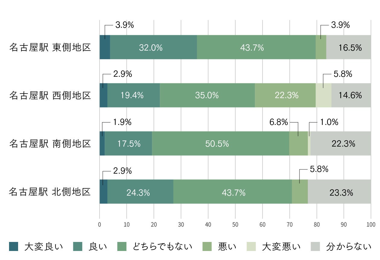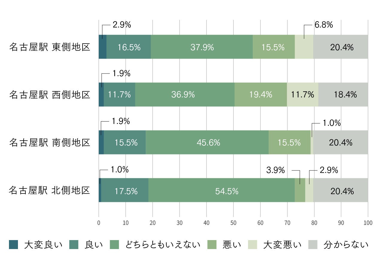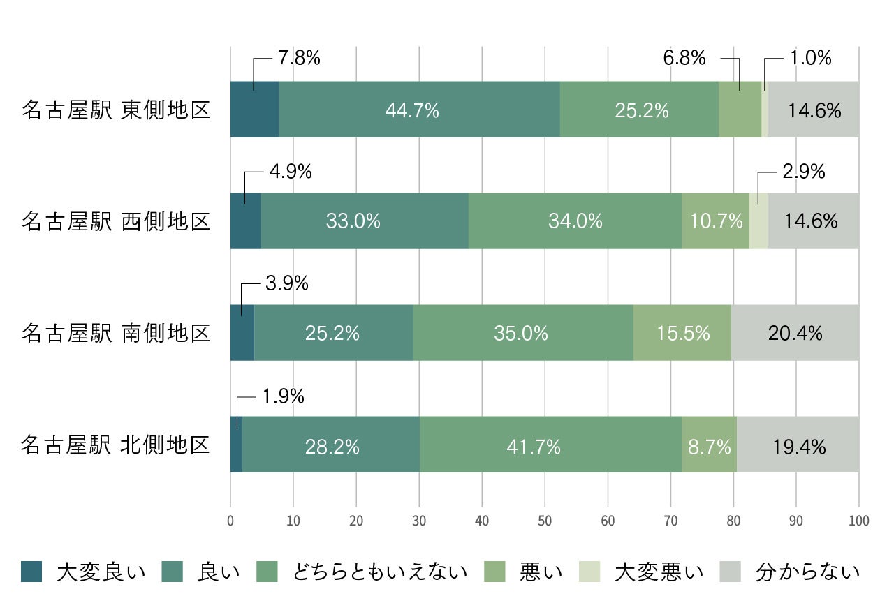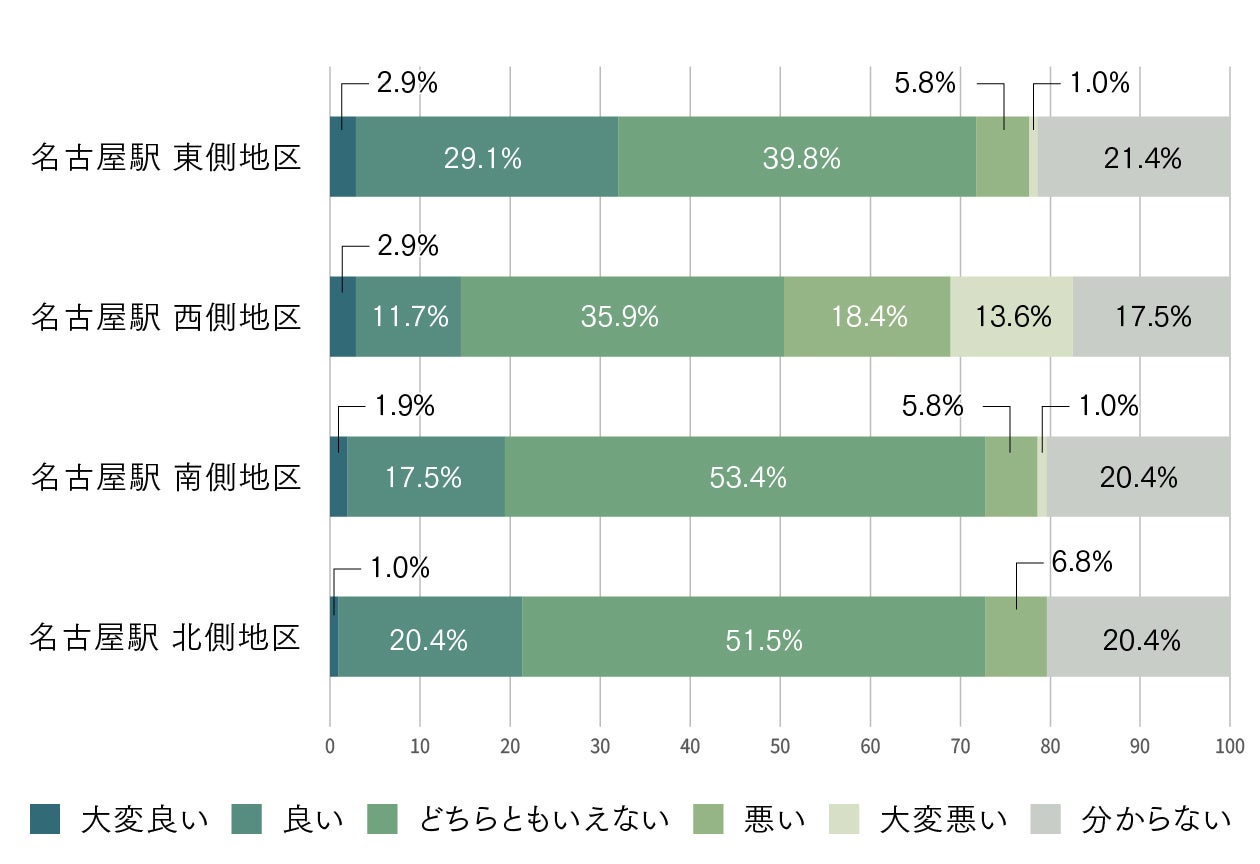 全体として中立的な回答をした方が多く、特に南側地区・北側地区においては「どちらでもない」の割合が約半数に上るなど、知名度に懸念が残るような結果となりました。また、名古屋駅の中心の玄関口となる東側と西側ではそれぞれ概ね良い印象(=東側)、やや否定的(=西側)に偏るなど、明暗がはっきりと分かれるような形となりました。
