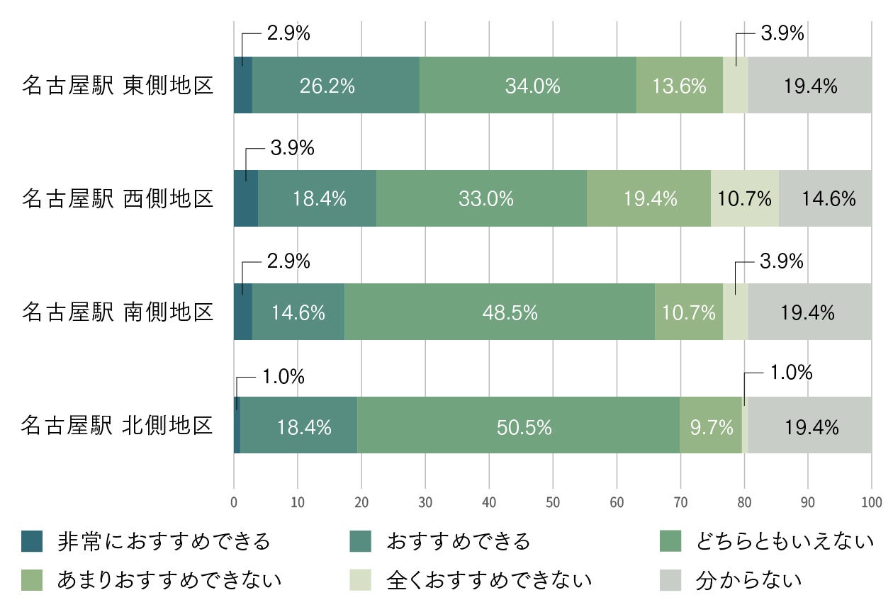 アンケートの全体の結果として、「非常におすすめできる」・「おすすめできる」の肯定的な回答の割合が最も高かったのは東側地区であり、商業施設や飲食街が集まる名古屋の顔としておすすめできると回答した方が多かったようです。また、西側地区については、「おすすめできる」という肯定的な回答と「おすすめできない」という否定的な回答の割合が拮抗しており、南側地区と北側地区では「どちらともいえない」の中立的な回答が高い割合を占める結果となりました。