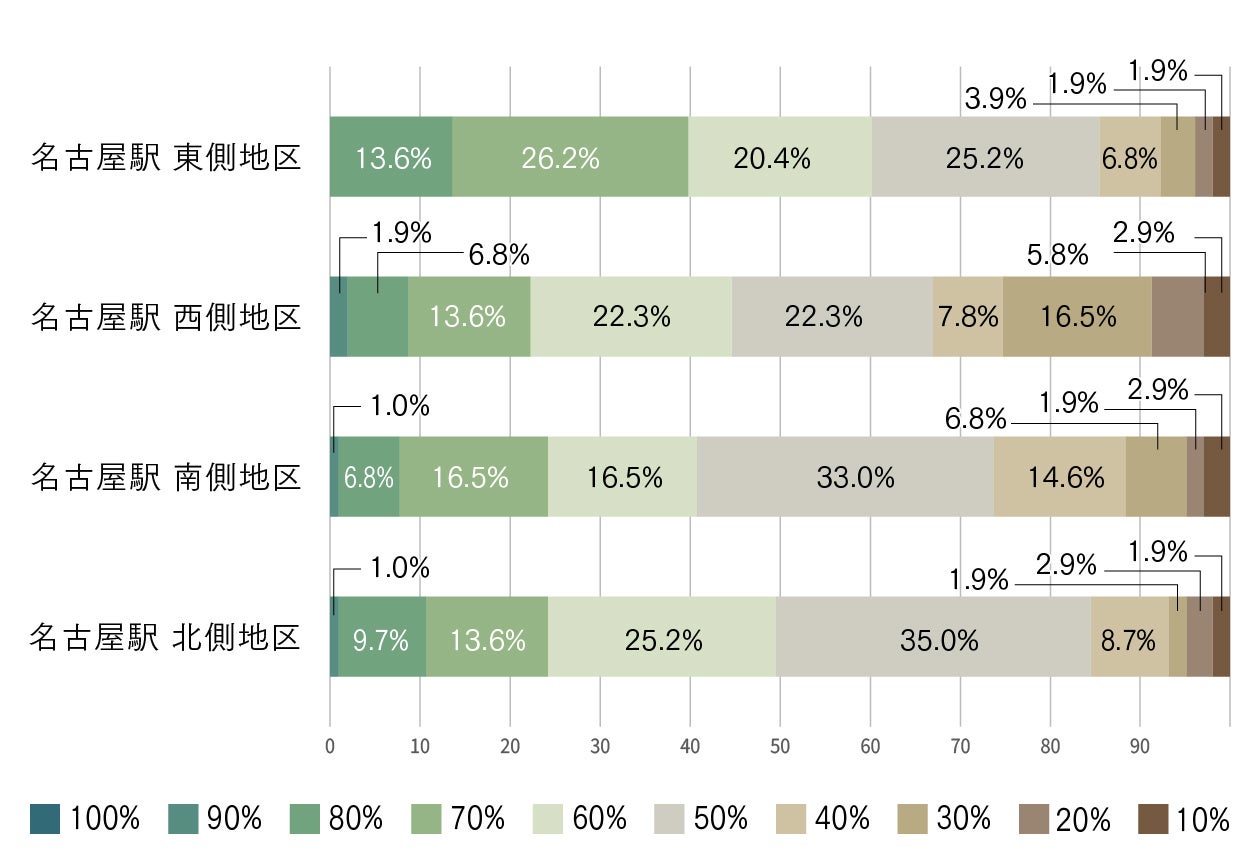 東側地区については、全体の8割以上が「魅力度50%以上」との高い評価をつけており、名古屋駅の玄関口である東側の総合評価は、他地区と比べてかなり高いことが明らかになりました。