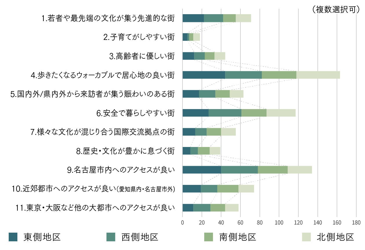 西側地区では、1位が「歩きたくなるウォーカブルな街」、2位が「名古屋市内へのアクセスが良い」、3位が「安全で暮らしやすい街」となりました。様々な個店が立ち並び、飲食街として栄える西側地区にも、回遊性を高めることや市内へのアクセスを高める声が多く集まっていることが明らかになりました。