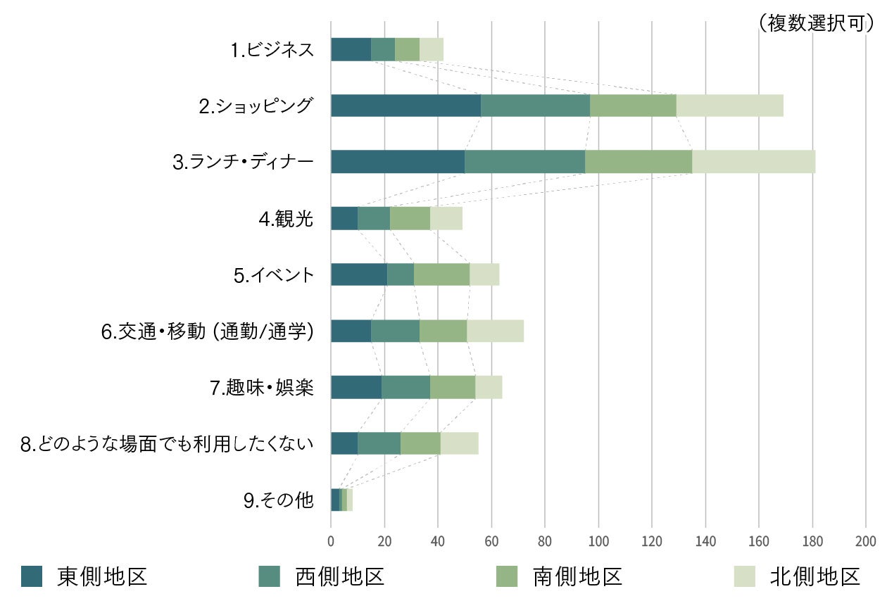 東側地区では、「ショッピング」(54.4%)、「ランチ・ディナー」(48.5%)が多く選択され、商業施設や複合ビルが立ち並ぶ東側地区のイメージ通りの回答となりました。