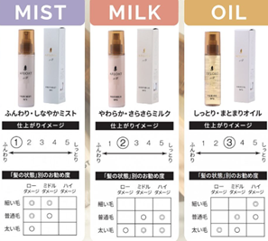 ヘアミスト/ヘアミルク/ヘアオイルの3種類で使いやすいラインナップを展開。