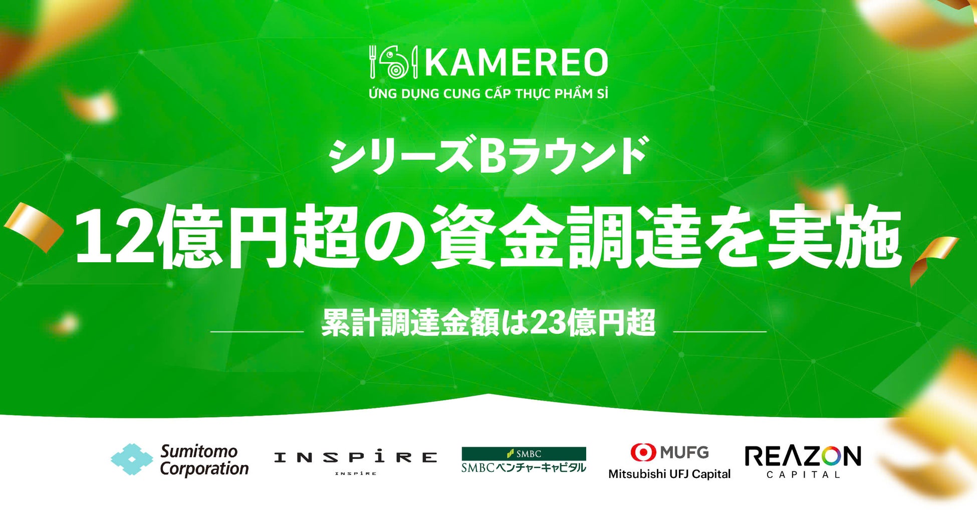 ベトナムで事業者向け食材Eコマースを展開するKAMEREO INTERNATIONAL PTE. LTD.(代表取締役: 田中卓、本社: シンガポール、以下KAMEREO)は、住友商事株式会社(代表取締役:上野 真吾、本社: 東京都千代田区)、INSPiRE Mutualistic Symbiosis Fund 1投資事業有限責任組合(無限責任組合員 株式会社インスパイア・インベストメント、代表取締役:高槻亮輔、本社:東京都港区)、SMBCベンチャーキャピタル株式会社(代表取締役社長:佐伯 友史、本社:東京都中央区)、三菱UFJキャピタル株式会社(代表取締役社長:小島 拓朗、本社:東京都中央区)、株式会社レアゾン・ホールディングス(代表取締役:渡邉 真、本社: 東京都新宿区)、その他個人投資家からシリーズBラウンドにて12億円超の資金調達を実施いたしました。今回の調達により累計の資金調達金額は23億円超となります。