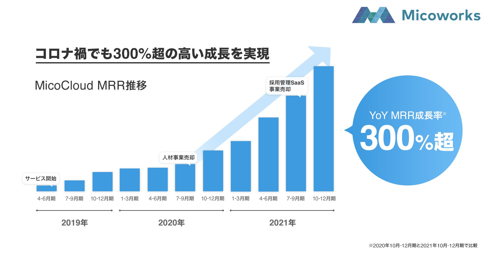 導入企業はBtoC事業を展開する企業を中心に、美容サロンや学習塾、百貨店や小売業、人材紹介業や不動産業など、幅広い業種への導入実績があります。また、コロナ禍においても急速な事業拡大を実現しており、2021年3月より「MicoCloud」事業に集中し人員拡充や採用強化を行い、サービス提供や開発体制を強化したことなどを背景に、成長率は前年同期比300%超(2021年10-12月期)、直近3ヶ月のサービス継続利用率は99.4%(2021年12月時点)を達成しています。