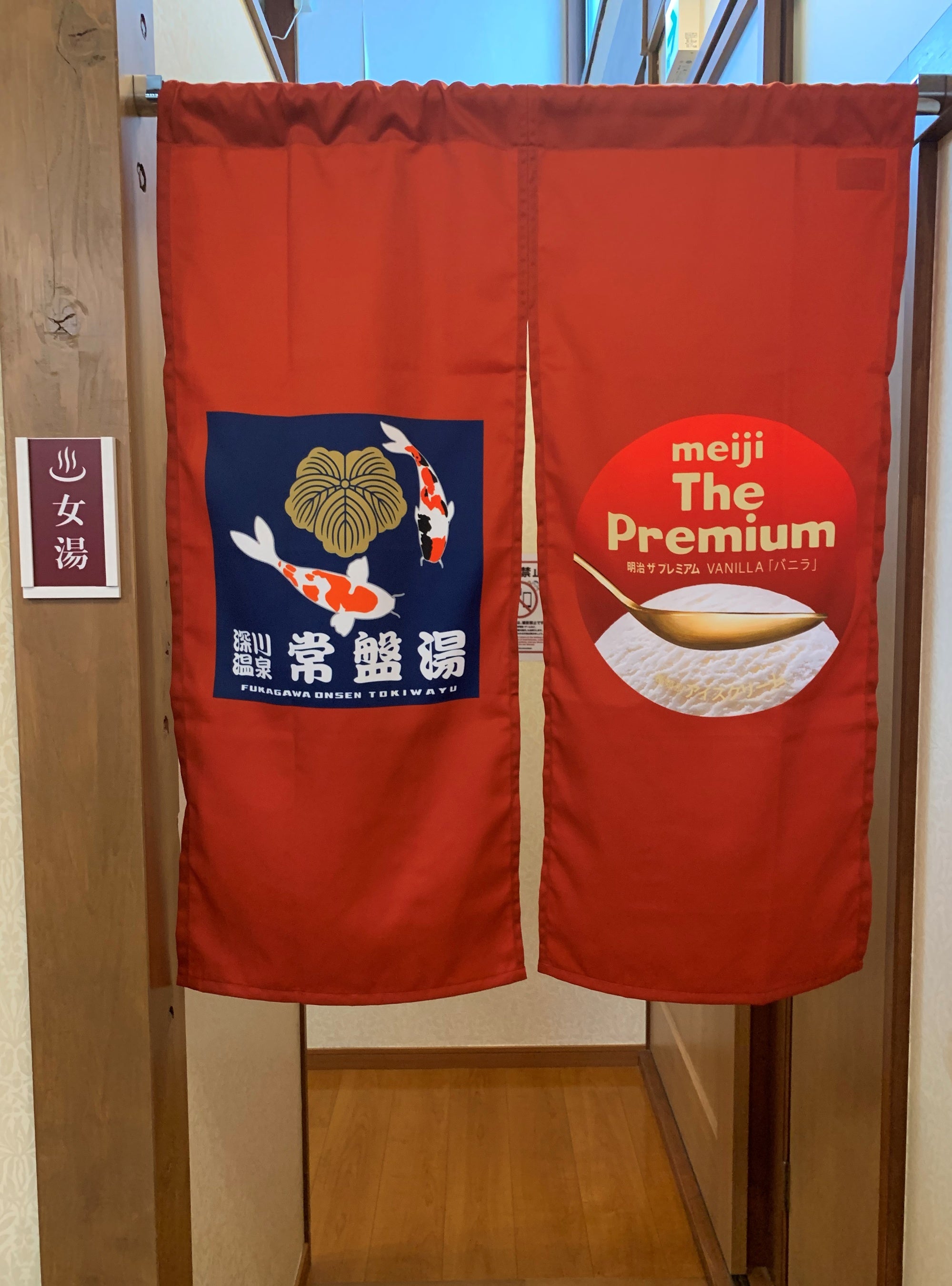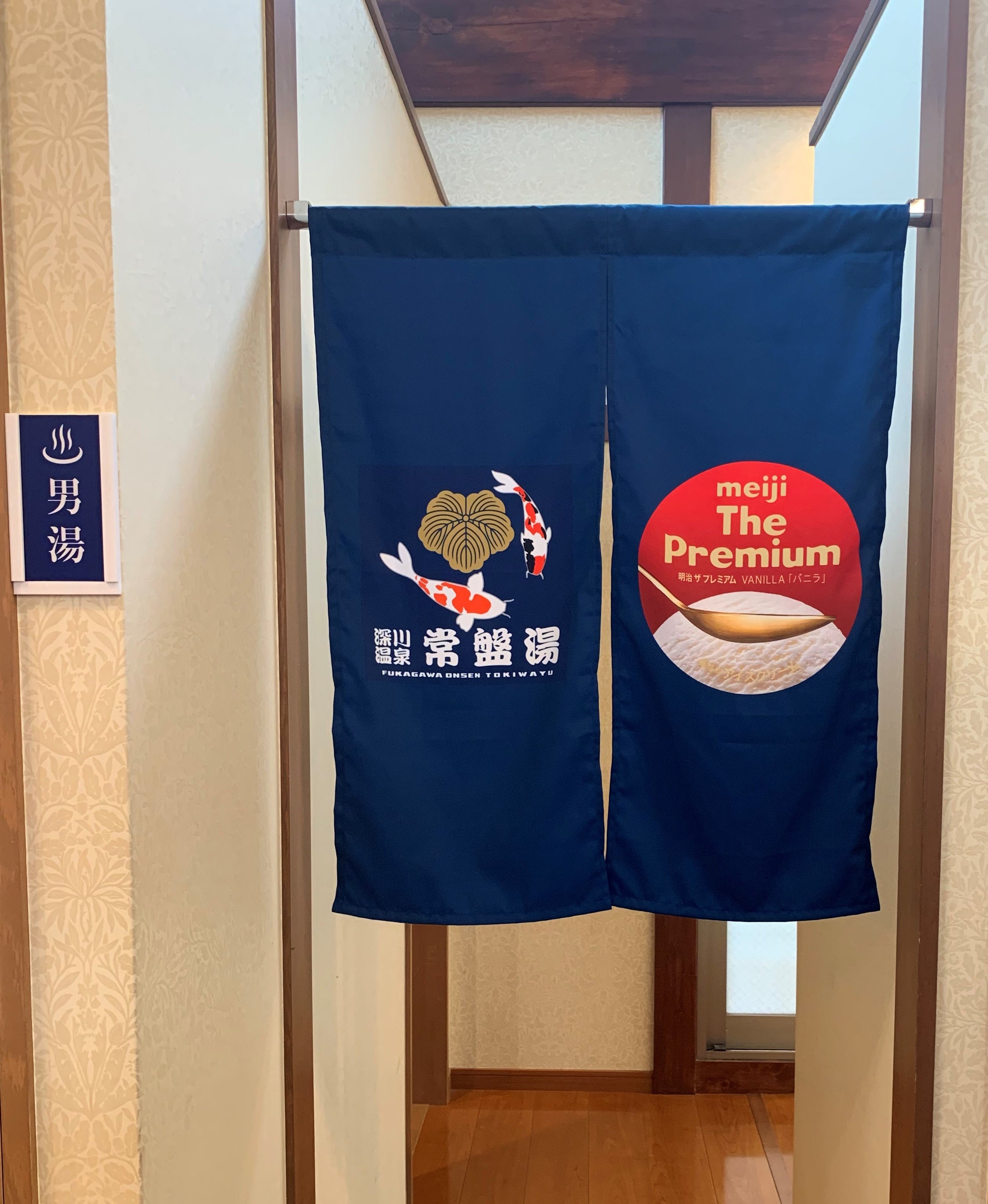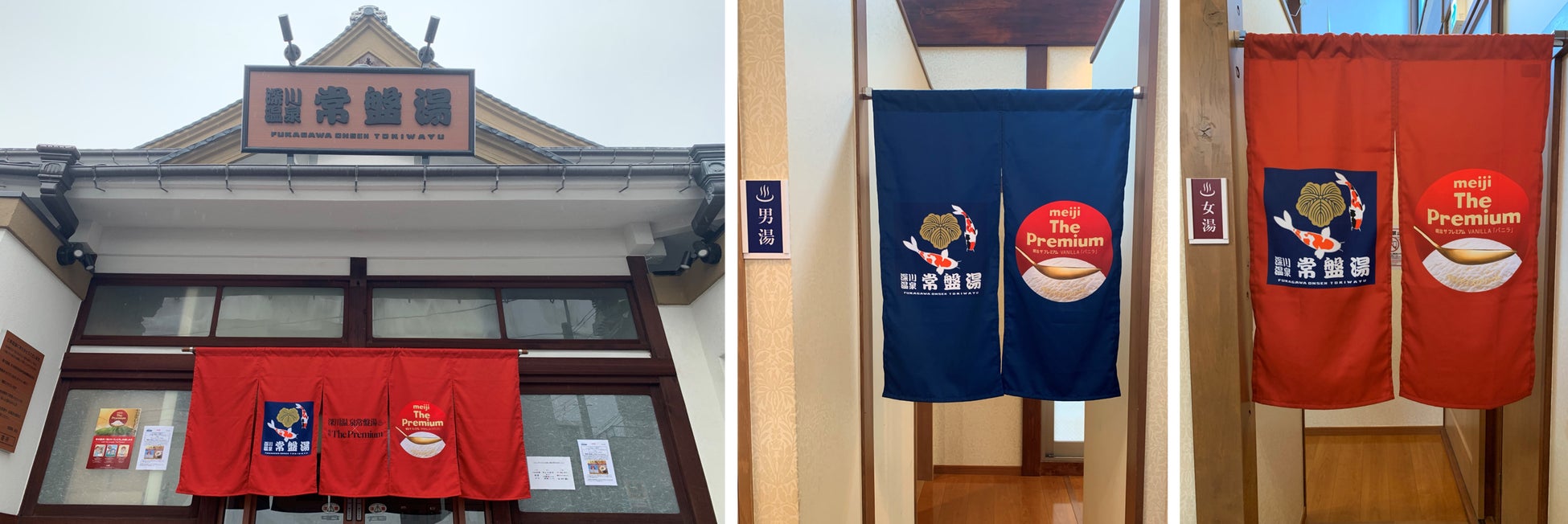 本企画では、冬の風物詩である温泉やお風呂、そしてサウナの後に、まるで雪どけ状態になり食べ頃になった「明治 The Premium」のプレミアムな味わいをたっぷりと味わう体験していただきたく開催しました。期間中はのれんをはじめ、常盤湯全体を「明治 The Premium」仕様にジャックします。