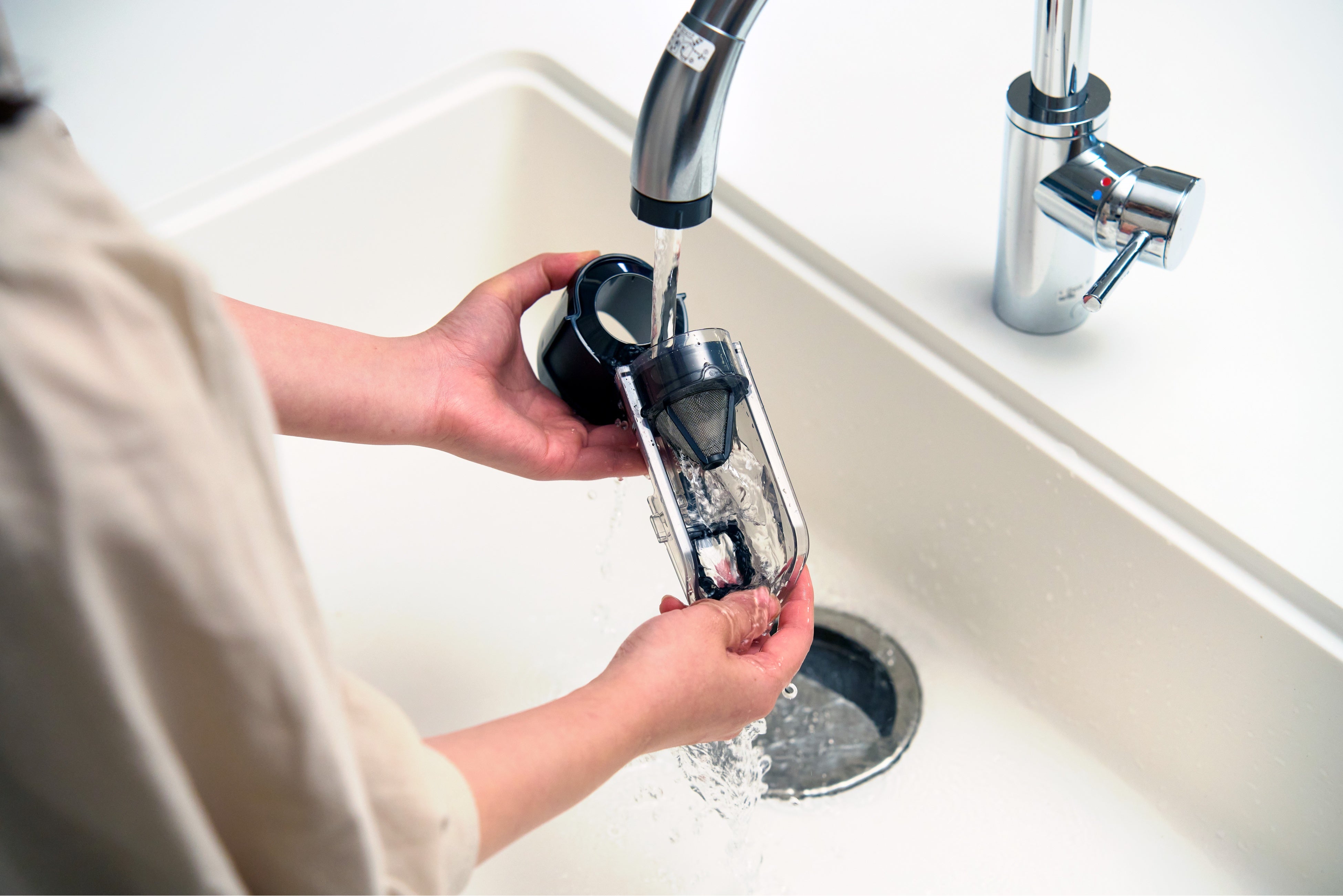 「自動ゴミ収集ドック」を搭載していますが、掃除機本体のボタンを押すだけでも簡単にゴミ捨てが可能です。ゴミに触らなくていいので衛生的です。ダストカップやフィルターも水洗いができるので、いつも掃除機を清潔に保てます。