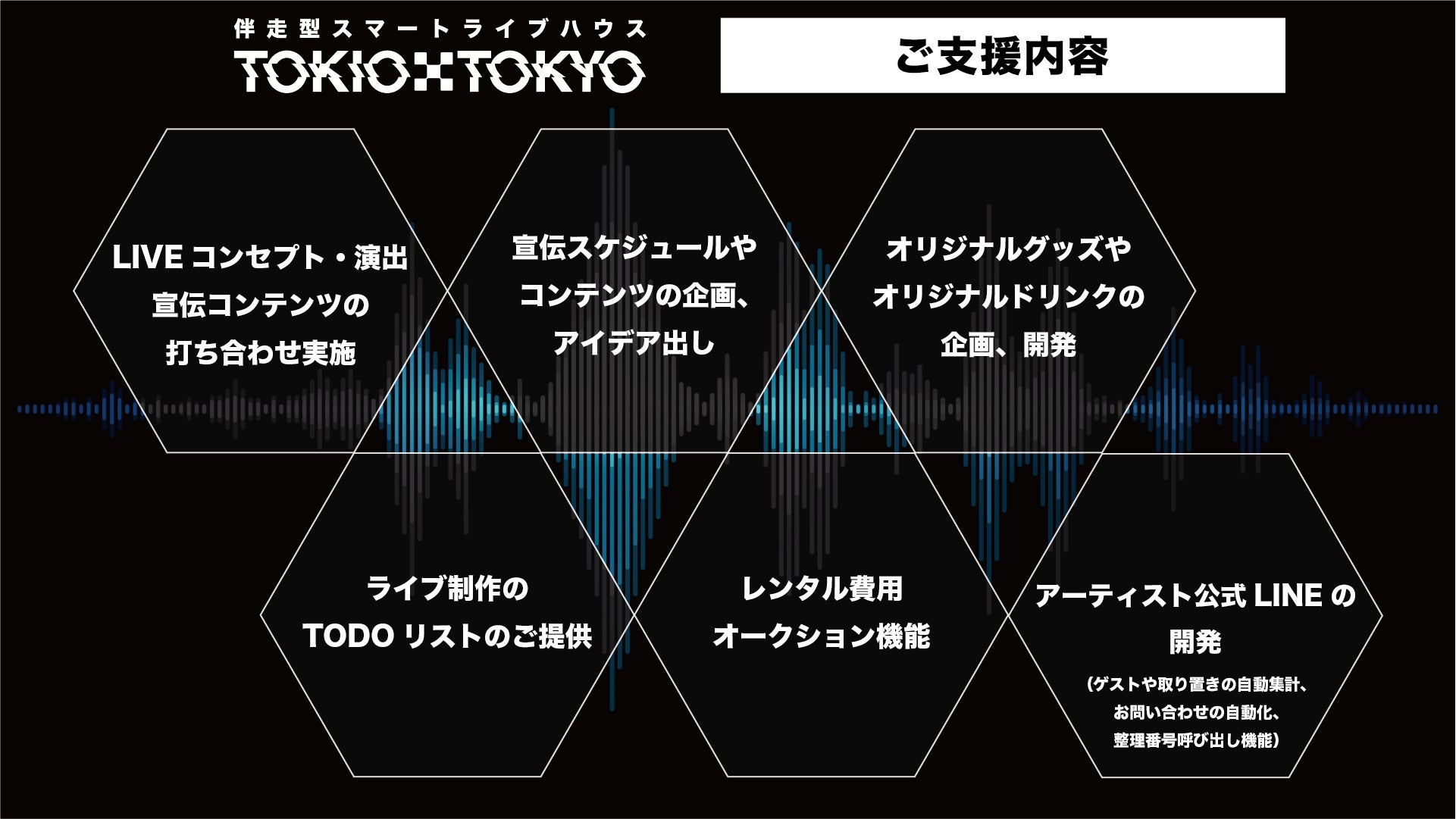 そういった課題に対して、『TOKIO TOKYO』ではスタッフによる企画でのアプローチと、自社開発しているツール・システムによるアプローチで、アーティスト様や事業者様の課題を解決して参ります。企画でのサポートでは、これまで600件ほどのライブ開催実績から見えてきた企画・宣伝ノウハウを活用し、ワンマンや対バンなど形式問わずライブイベントの企画性の向上や、宣伝コンテンツの企画にご協力させていただきます。また、システムでのサポートとして、ライブ制作でのアーティスト様の負担を軽減するようなツールや、ご来場者様に、より快適にライブを楽しんでいただくためのツールなどをご提供予定です。