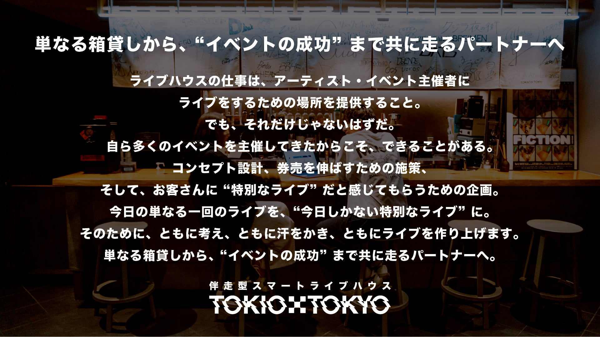 「動員ができるか不安」「ワンマンライブはまだ先かな...」といったような不安を抱えるアーティスト様や事業者様でも、安心して「まずは相談できるライブハウス」として、”伴走型スマートライブハウス”『TOKIO TOKYO』は尽力して参ります。