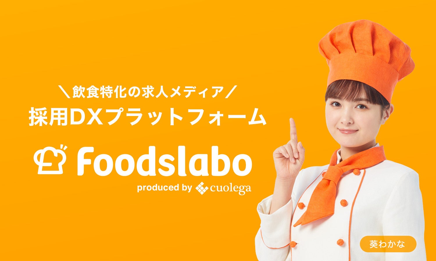 この度、食産業特化型転職支援サービス「フーズラボ」のイメージキャラクターに、葵わかなさんを抜擢させて頂きました。フーズラボのロゴにある食産業を連想させるコック帽と、葵わかなさんの被るコック帽をリンクさせ、オレンジを基調とした温かみのあるコンセプトに仕上がっております。