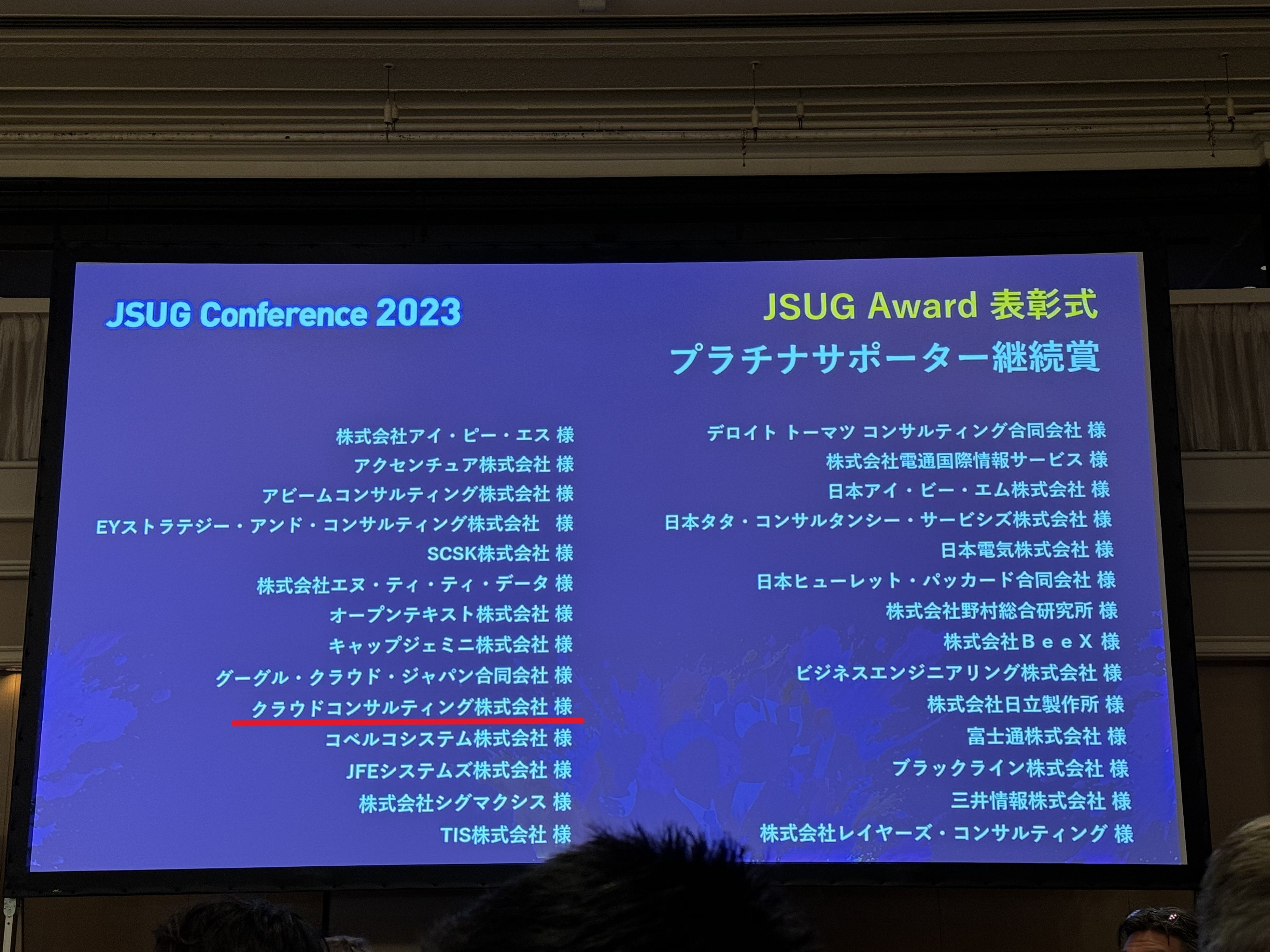 この度、クラウドコンサルティング株式会社(代表取締役 岸仲篤史、東京都港区、以下当社)は、JSUG Conference 2023にて、プラチナサポーター継続賞を受賞させて頂きました。
