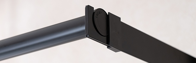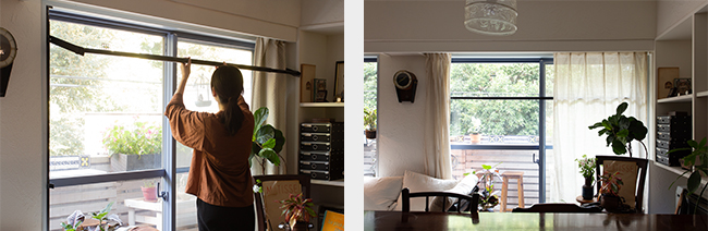 FRAMESは、つっぱり式で電動工具がなくてもしっかりと固定できます。また、窓枠に沿って取り付けると一段とすっきり収まります。カーテンの内側にある窓枠に取り付けることで、支柱をカーテンで隠すことができます。