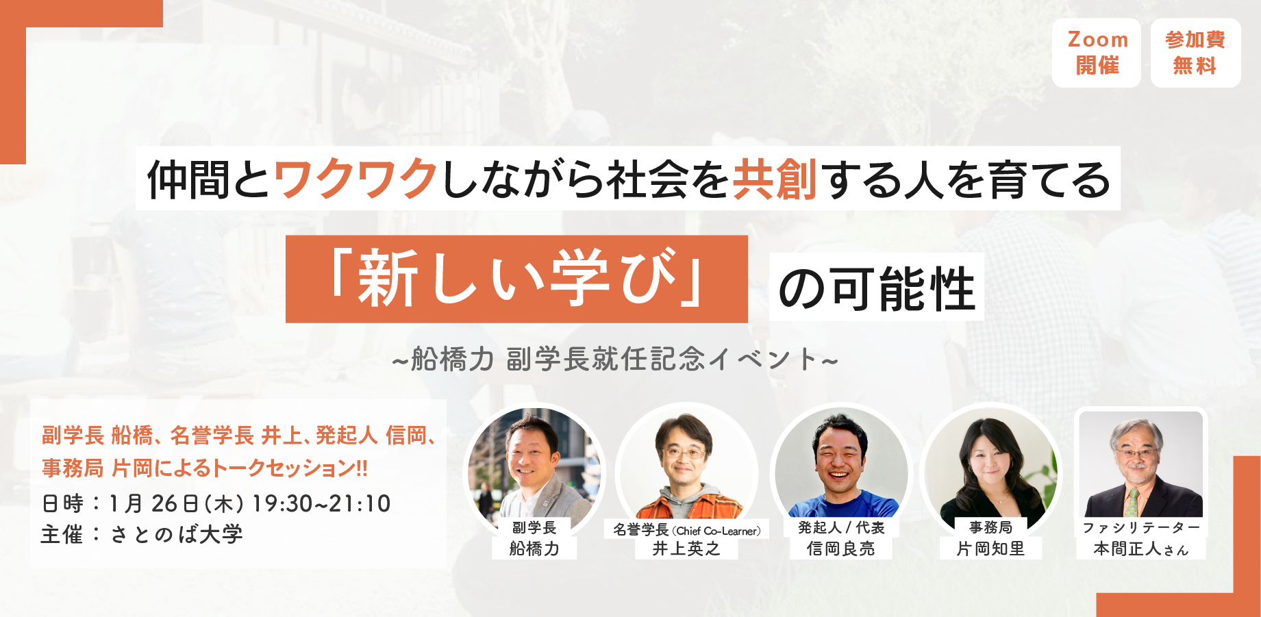 就任を記念して、さとのば大学の発起人である信岡良亮と、名誉学長であり「マイプロジェクト」という手法の生みの親である井上英之、事務局に新たに加わった片岡知里を交えたトークセッションを1月26日に実施いたします。ファシリテーションは、「教育学」を超える「学習学」の専門家である本間正人先生にお願いしました。