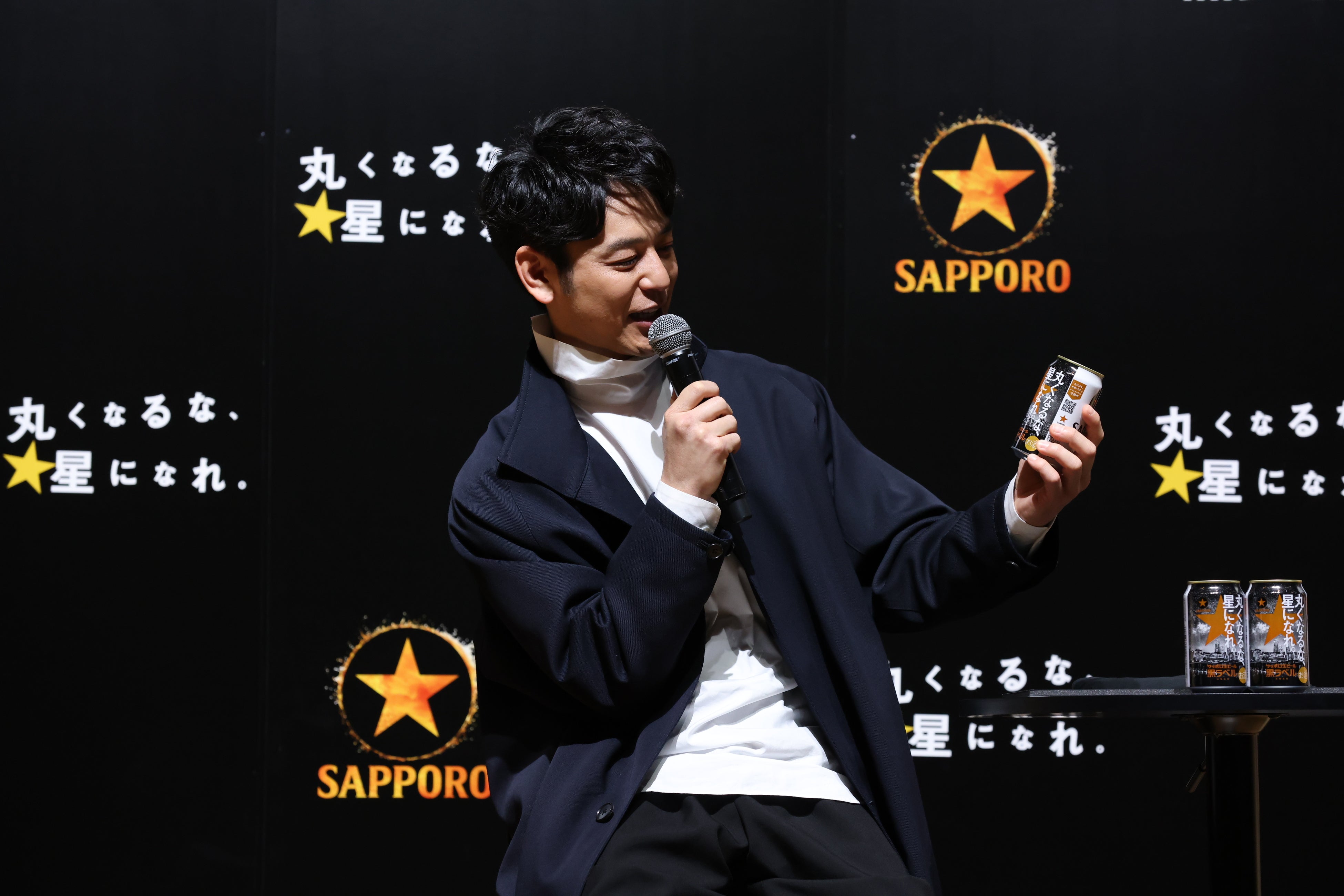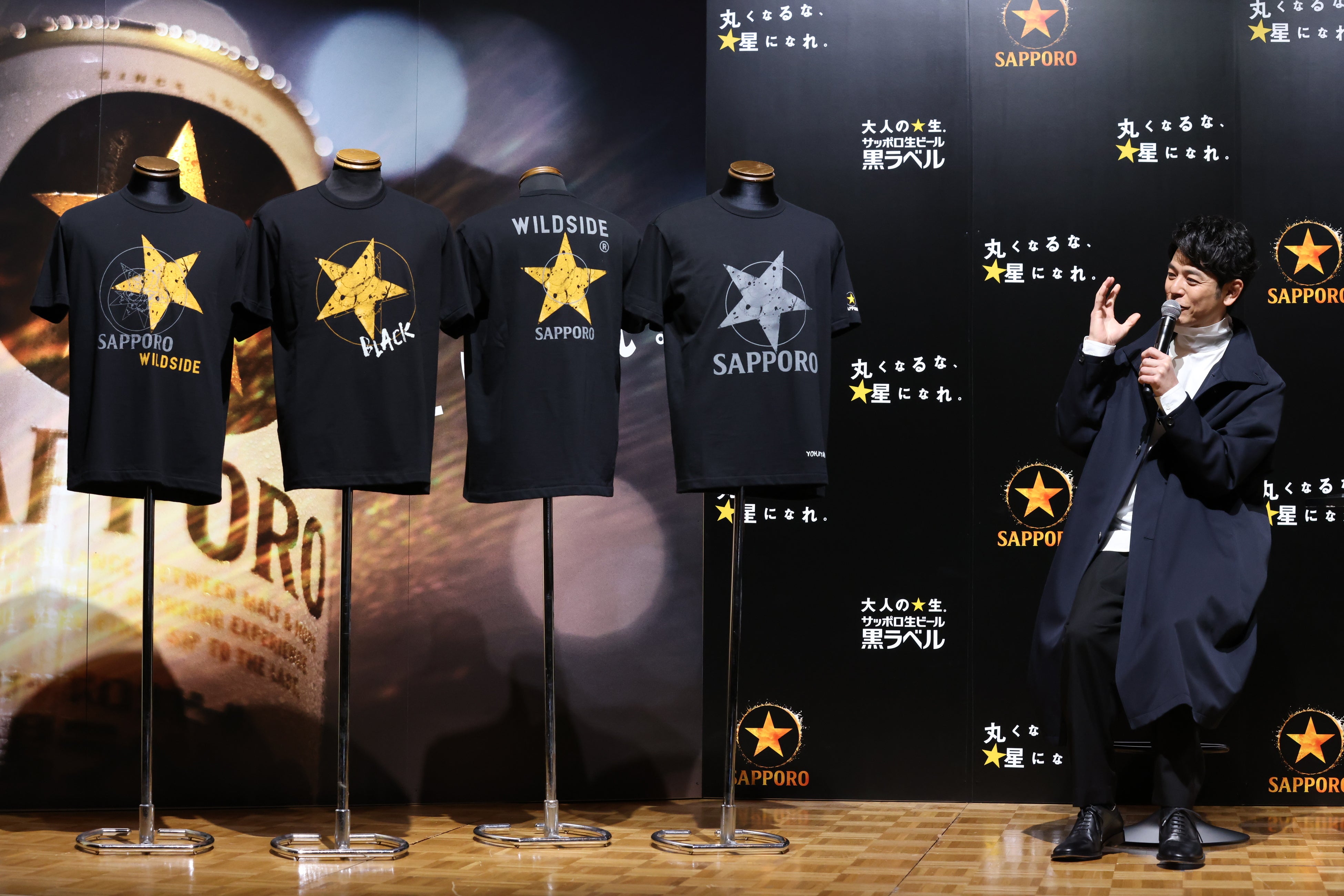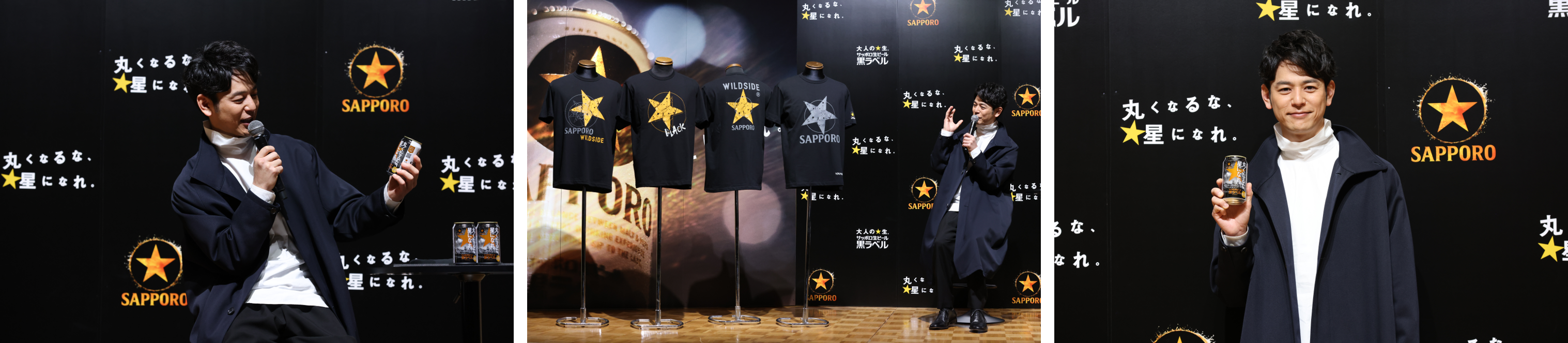 また、「サッポロ生ビール黒ラベル」TVCMに13年間出演されている妻夫木聡さんにご登壇いただき、新CMや数量限定発売のオリジナルメッセージ缶のお披露目、新生活シーズンに新たな挑戦をする大人の方へのメッセージなどをいただいたほか、新TVCM公開と合わせて展開する「STAR POINTキャンペーン」の第1弾賞品、WILDSIDE YOHJI YAMAMOTOとのコラボレーションTシャツのお披露目も行いました。