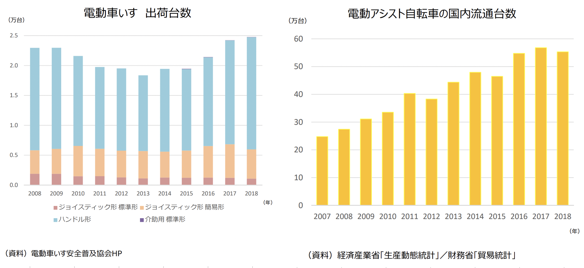 - 電動アシスト⾃転⾞の2018年の国内流通台数は約55万台で、10年程度で約2倍