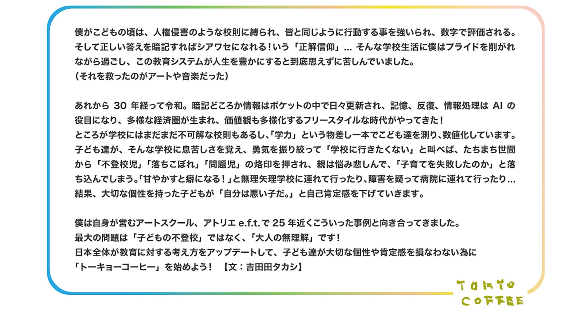 登校拒否の子の声から大人が学ぶ場【トーキョーコーヒー】を全国に作り、教育の選択肢を!2022年7月25日よりクラウドファンディング挑戦開始。