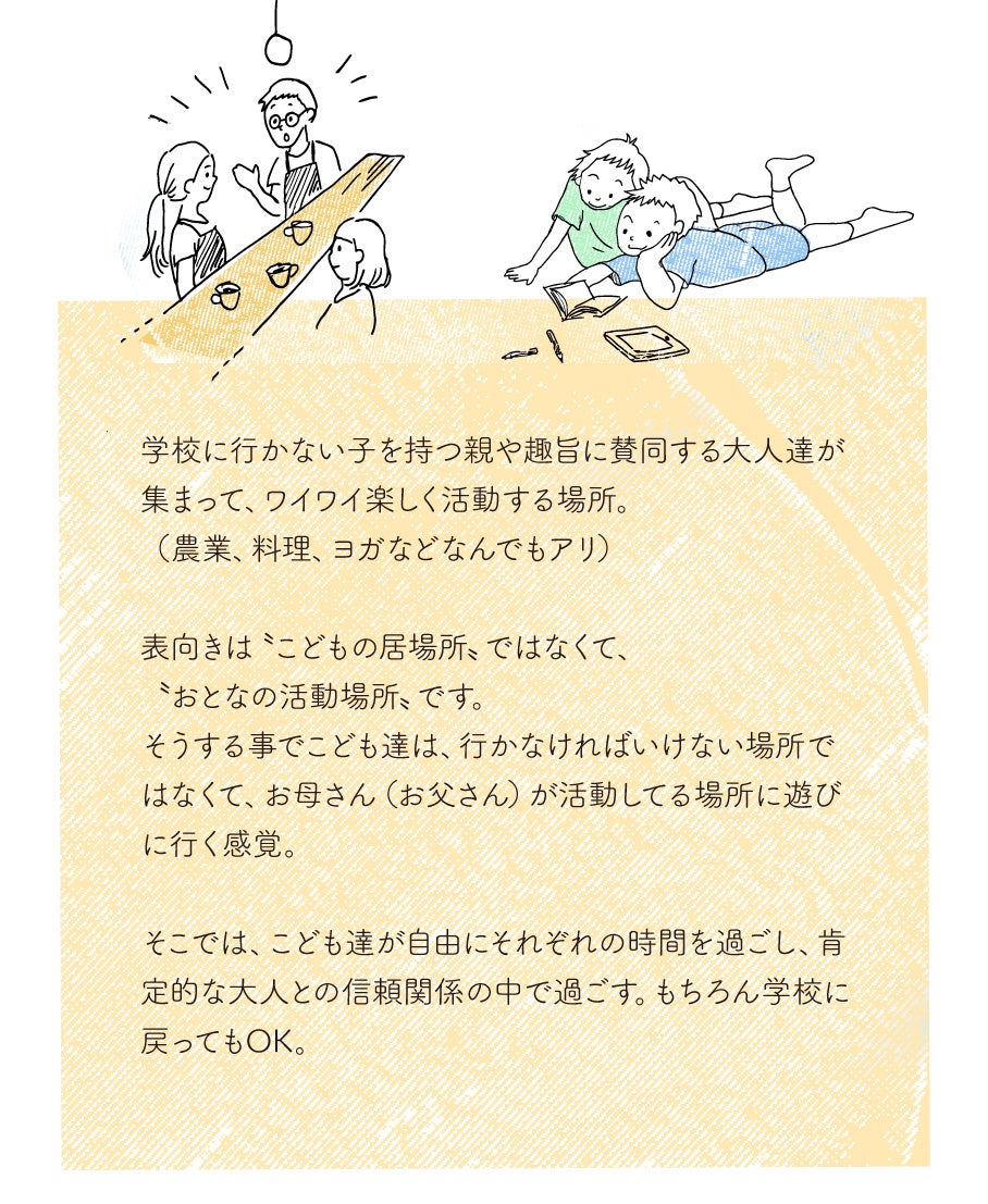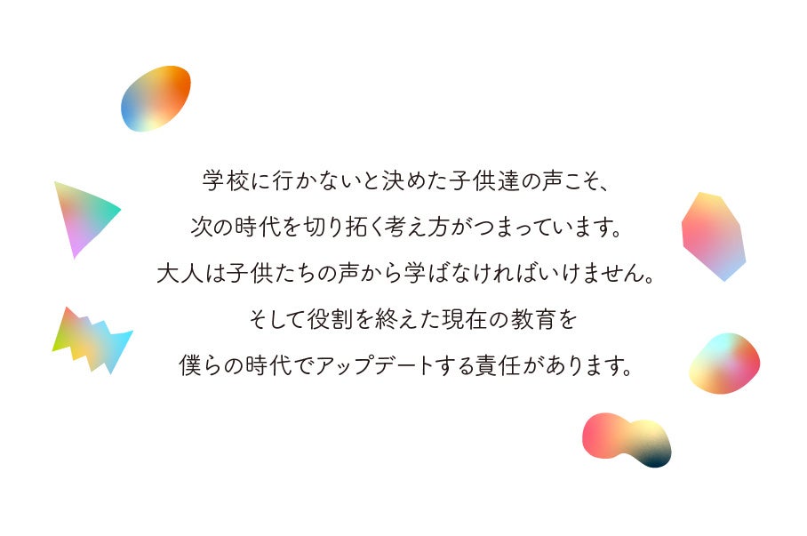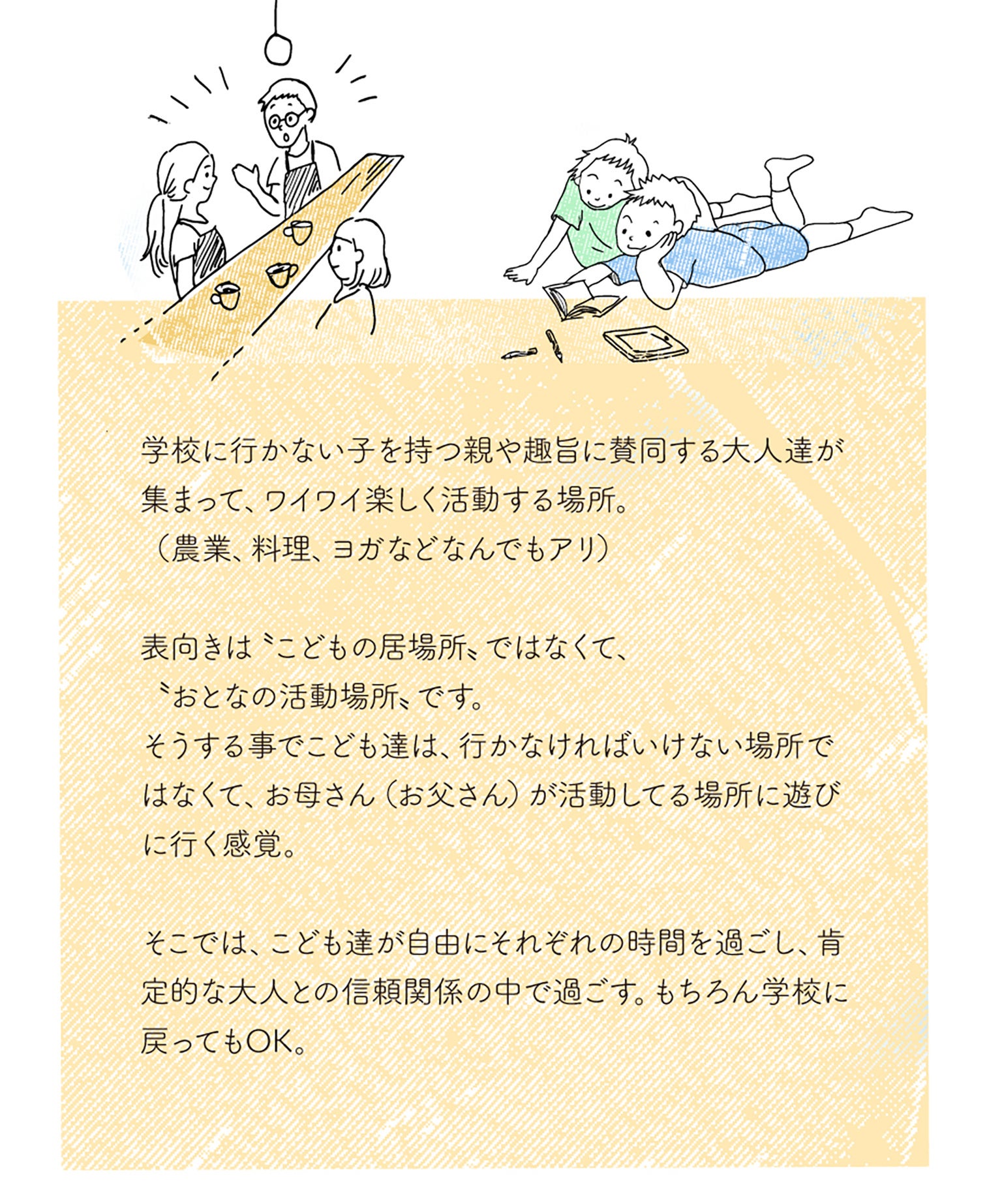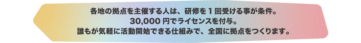 誰もが気軽に活動が開始できる仕組みで、学校に行かない子ども達が安心して過ごせる居場所を全国につくります。
