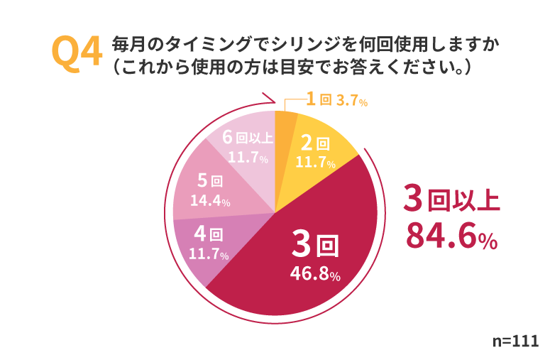 毎月のタイミングでシリンジを何回使用するかでは、3回が最も多く46.8%でした。3回以上を合計すると84.6%とシリンジだけでもかなりの回数を行っていることがわかります。