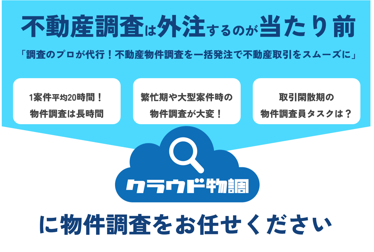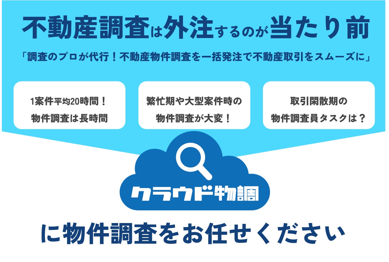 『クラウド物調』は、電話や問合せフォームから不動産物件調査業務を依頼できるサービスです。当社は創業10年、年間100件累計1,000件以上を越える豊富な不動産物件調査業務の実績を持ち、提供する物件調査レポートは顧客や業界関係者にも高く評価されてきました。『クラウド物調』では、当社のノウハウと150名を超えるパートナー調査員を活用し、幅広いエリアや物件種別にわたる不動産物件調査業務を代行します。『クラウド物調』では、「物件調査レポート」と物件調査の他、契約書や重要事項説明書のドラフト版をセットにした「物件調査一括レポート」の2つメニューがあり、お客様の要望に合わせ迅速な調査を提供します。