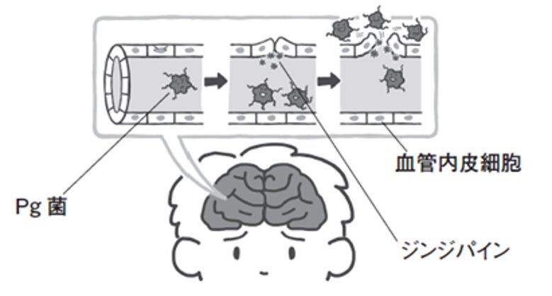 さらにPg菌は、自らの力で血管内に侵入して全身を巡ります。血液の移動を介して、口のなかから脳へとPg 菌が侵入していくのです。