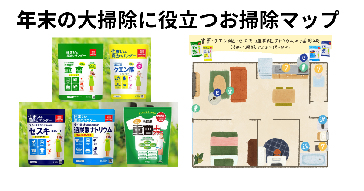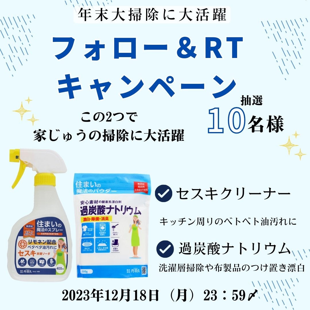 また年末のお掃除に役立つお掃除マップにも掲載されているセスキクリーナ・過炭酸ナトリウムをセットにして、X(旧Twitter)公式アカウントにてプレゼントキャンペーンも実施いたします。
