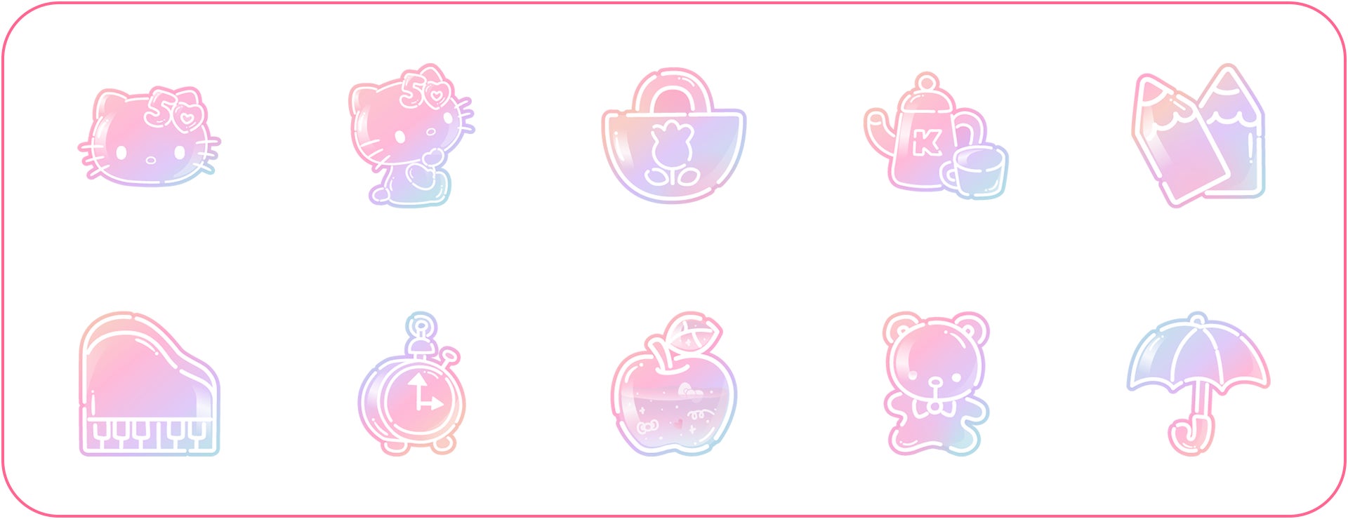 第1弾は2024年に50周年を迎えた「ハローキティ」をお祝いしたアニバーサリーイヤー限定で販売されるデザイン!リボンやテディベアなど大好きなものをいっぱい詰め込んだ、クリアなデザインのハローキティがゆめかわいい着せかえとスタンプです。