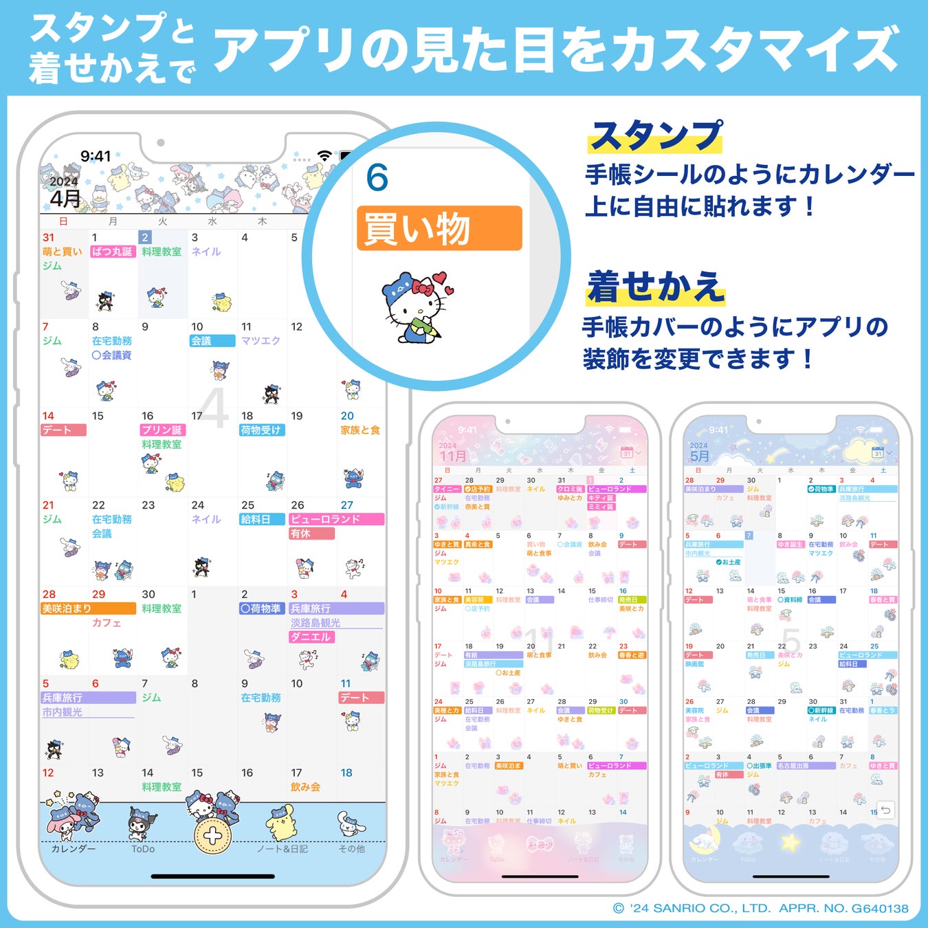 第1弾はハローキティ50周年記念デザイン。その後もシナモロール、ポムポムプリン、クロミ、マイメロディ、キャラクターユニットのはぴだんぶいなど様々なキャラクターの着せかえ、スタンプをリリースします。