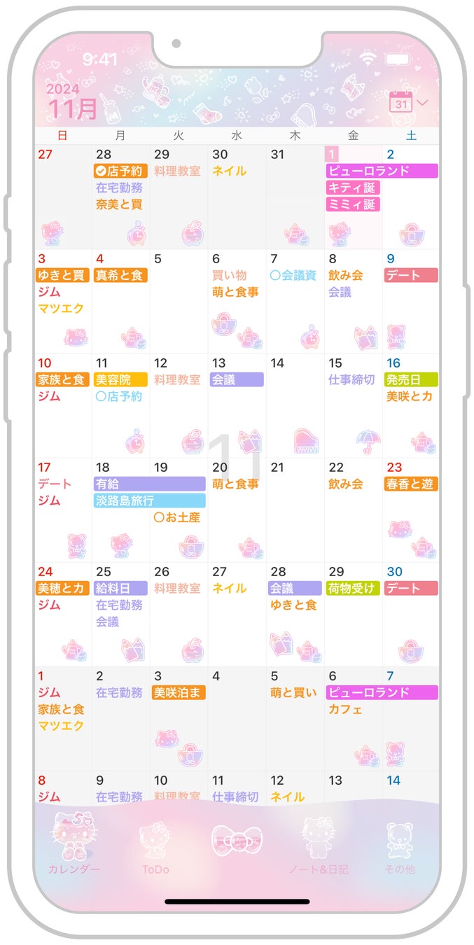 「誕生日」「デート」「会議」「グッズ発売日」などの予定を種類別に色分けをして登録すれば、プライベートからお仕事まで一目で分かりやすく管理ができます!