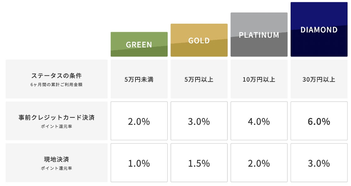 ・6ヶ月間の累計ご利用金額に応じてGREEN、GOLD、PLATINUM、DIAMONDの4つステータスで、旅するほどお得になるポイント還元率を設定しております