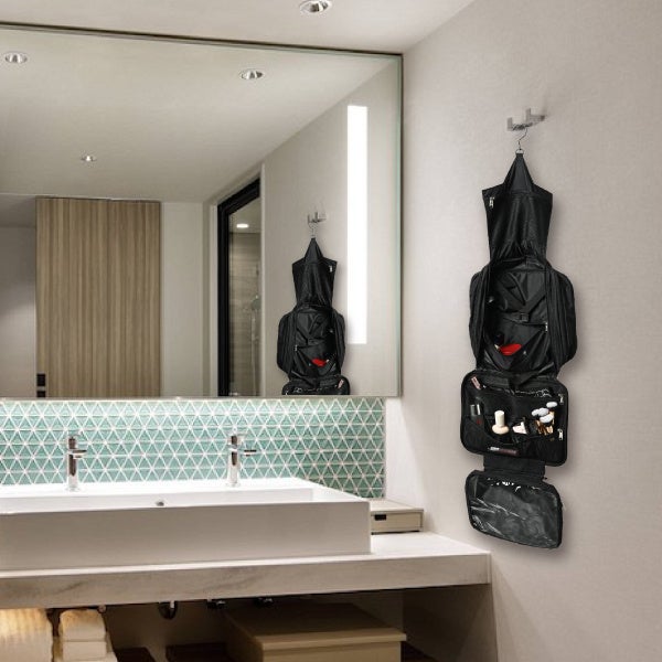 ホテルの洗面所やバスルームのタオル掛けにフックをかけて吊るすことができます。