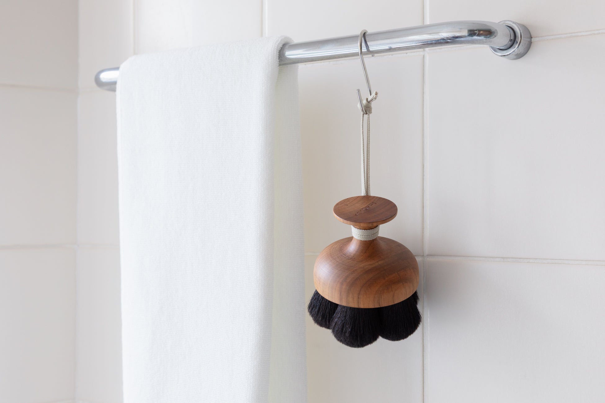 熊野の職人が一つ一つ手作業で作る心地よい穂先が肌に密着し、やさしい刺激でめぐりにつなげます。エレガントな曲線は、見た目の美しさのみならず手指に自然にフィットする設計。力を入れずとも安定した操作が可能です。
