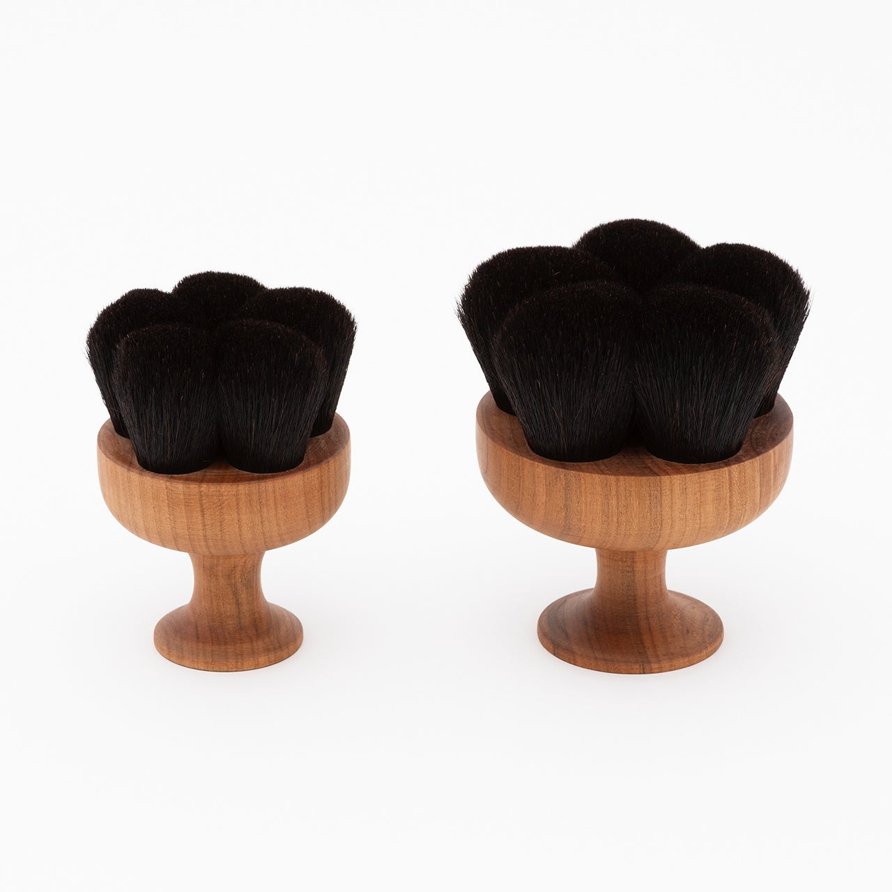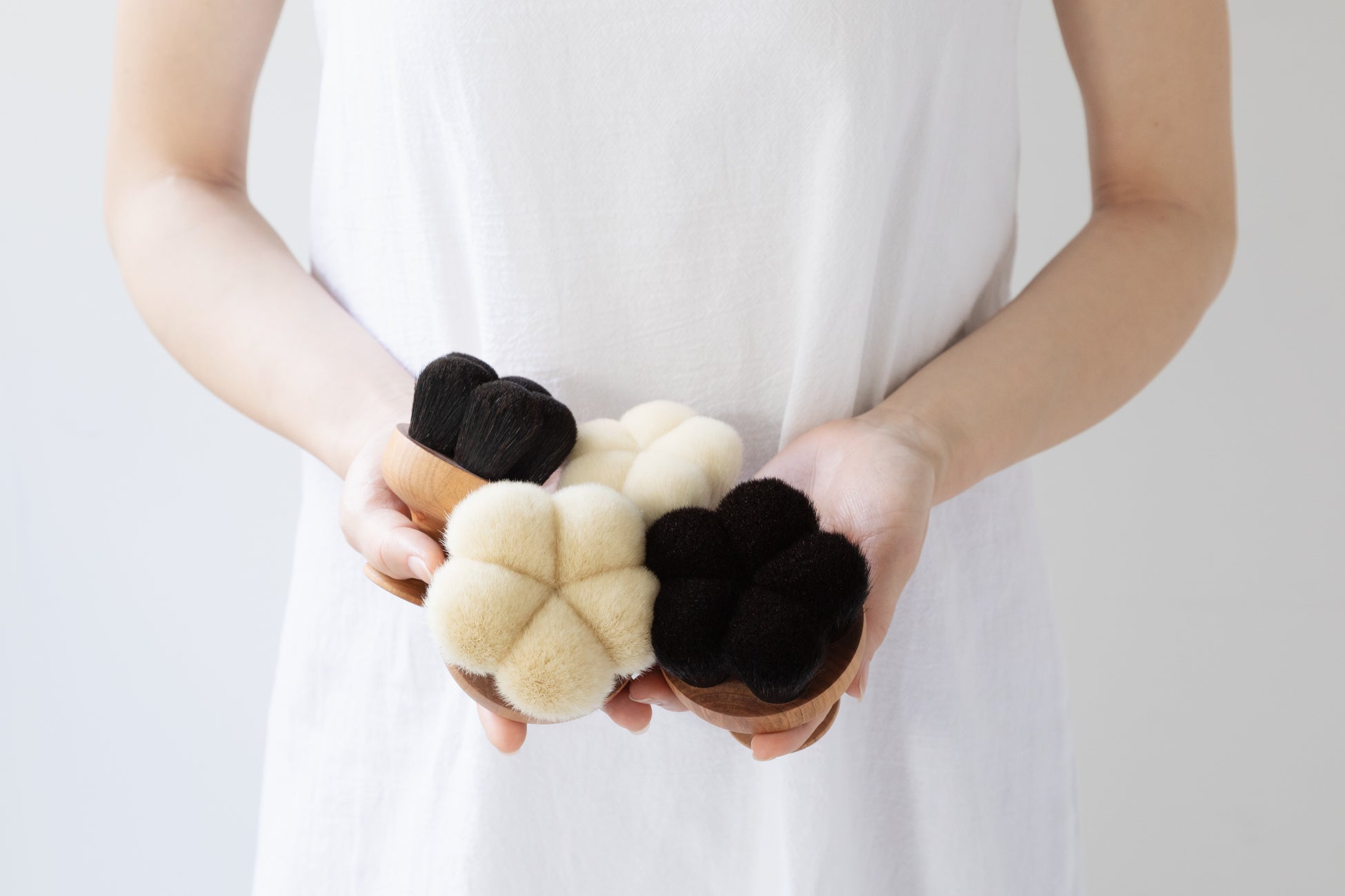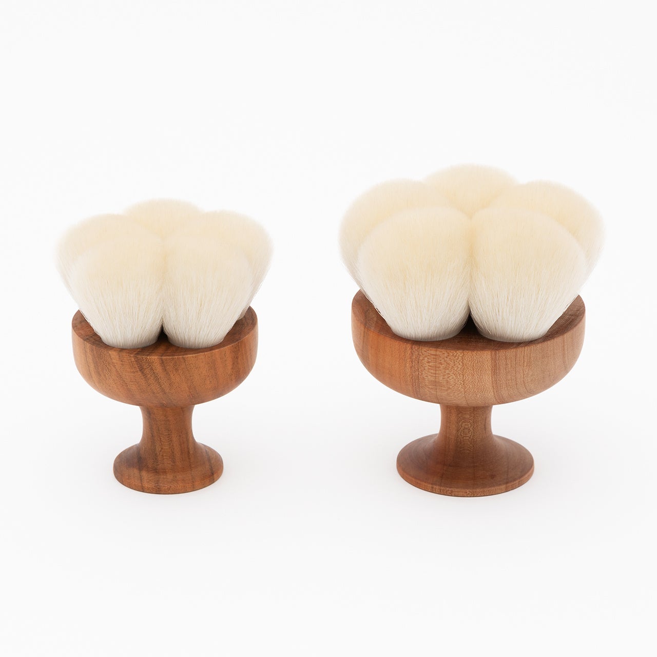 ラインアップは、山羊毛を主体としたやわらかな穂先の IYASHI BRUSH(イヤシブラシ) と、豚毛を主体とした適度なコシのある MEGURI BRUSH(メグリブラシ) の2タイプ、各々S、Lサイズの