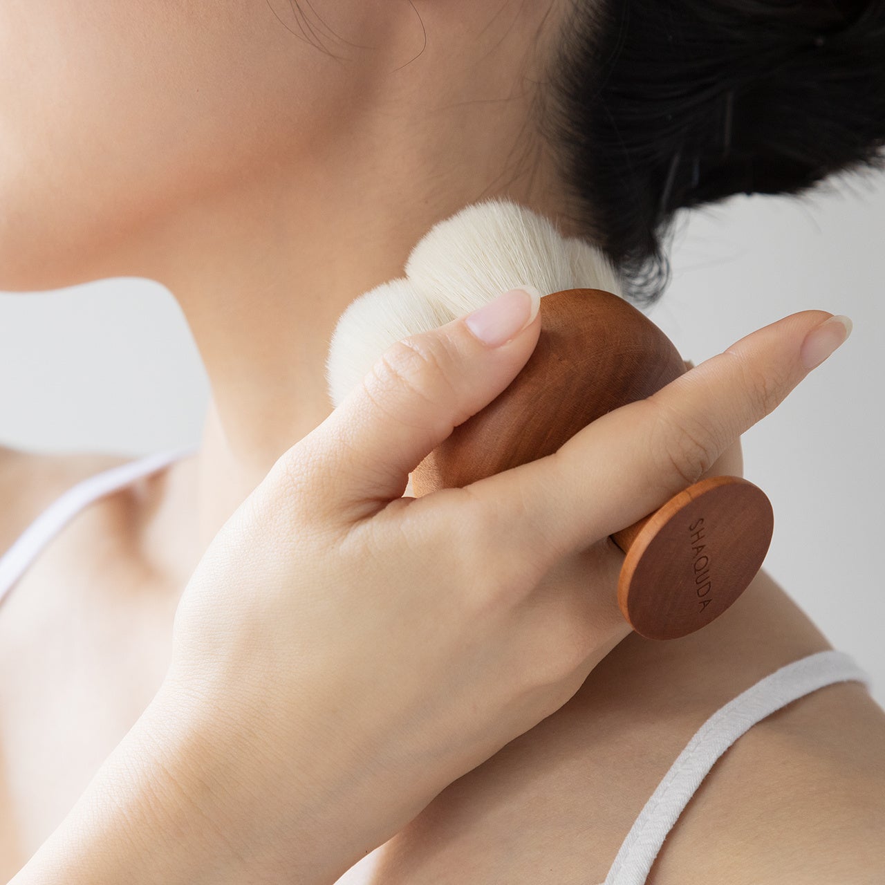 細やかなタッチが叶うSサイズは、乾いた状態では、ドライブラッシングとして首筋やデコルテ、腕、手先といった部位のケアに。