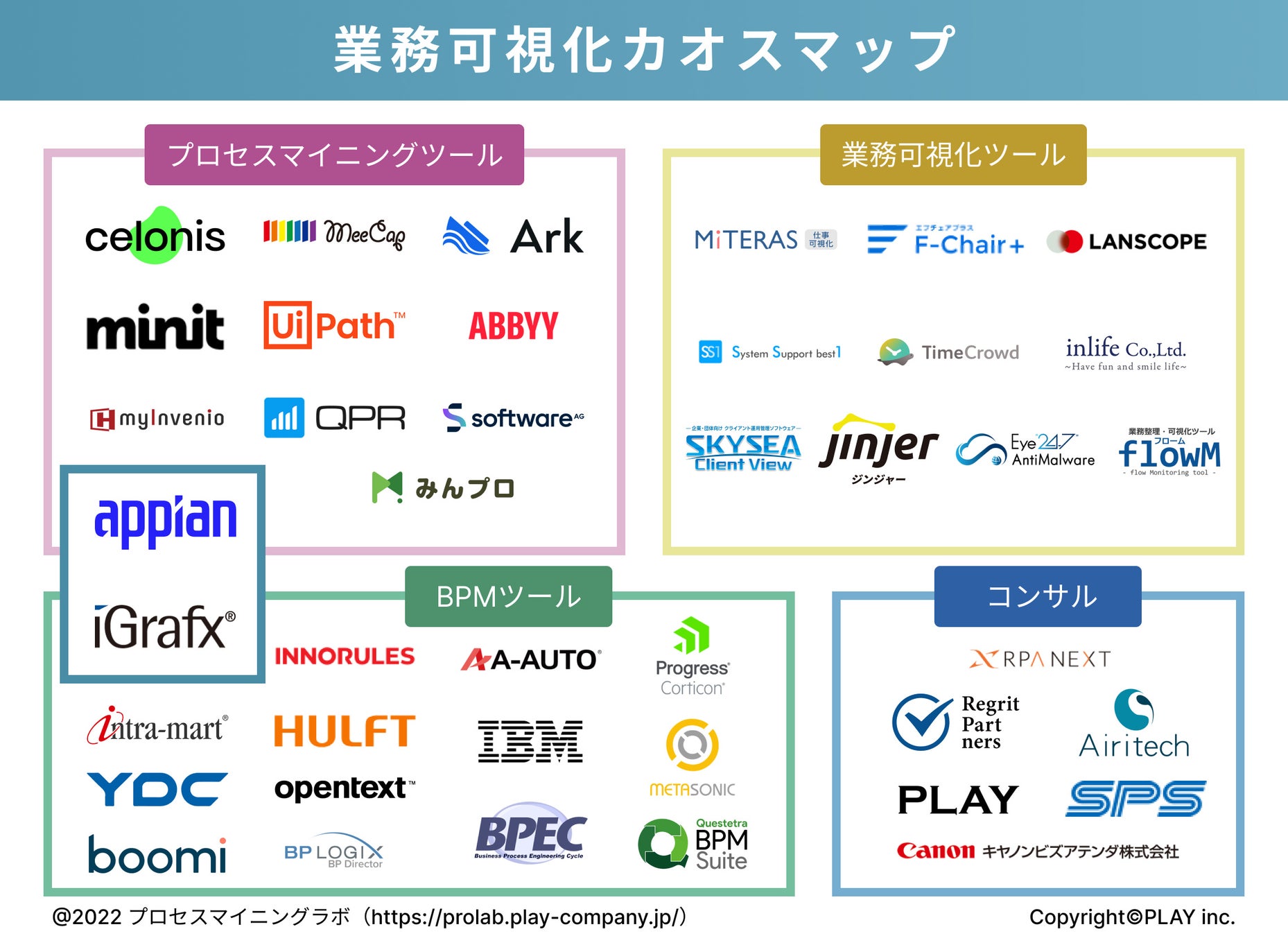 PLAY株式会社(所在地:東京都渋谷区、代表:与田明、以下「当社」という)はプロセスマイニング・BPM市場を含めた「業務可視化カオスマップ」の2022年版を公開いたしました。
