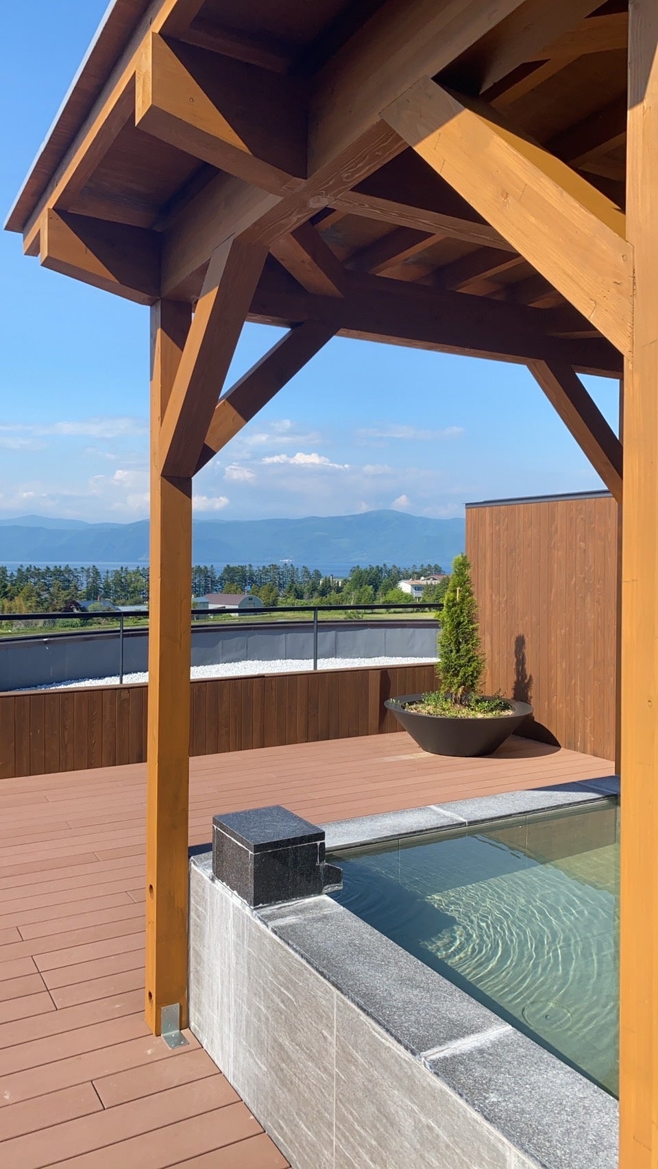 これまでの温泉露天風呂付和洋室の一部を改装し、広々とした空間をいかした植栽やチェアの配置と、露天風呂上部に新たに屋根を設置することでより快適に温泉露天風呂を愉しむ環境が整備されました。