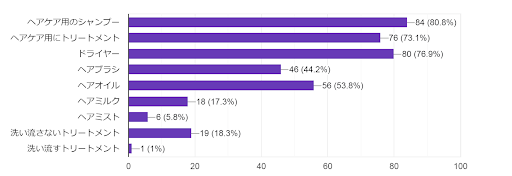 調査の結果、約8割の方がヘアケア用のシャンプーやトリートメント、ドライヤーを使用していることがわかりました。またヘアオイルを使用してヘアケアを行う方も5割以上いることがわかりました。