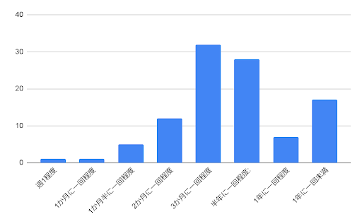 調査の結果、「3ヶ月に一回程度」と回答した方が32名で最も多く、「半年に一回程度」と回答した方が28名と2番目に多いことが分かりました。
