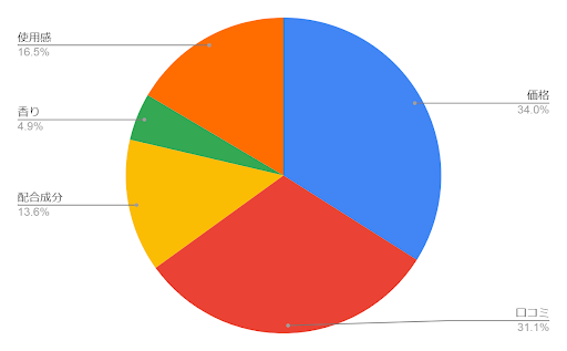 調査の結果、製品の価格や口コミに注目する方が多いことがわかりました。また、製品の配合成分や使用感を重視する方も一定数いらっしゃいました。
