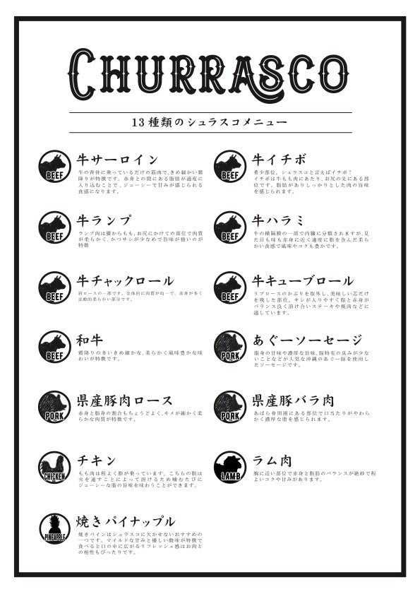 シュラスコはブラジル南部の州、リオグランデ ド スル州のガウショ(カウボーイ)が好んで食べていた肉料理が発祥。シンプルな料理がゆえに肉本来の旨みが凝縮された濃厚でジューシーな味わいを楽しむことができます。牛、豚、鶏、羊、ソーセージなど厳選した13種類のシュラスコを専用のグリルマシンで回転させながら、外はカリっと中はジューシーに焼き上げます。肉汁滴る塊肉をゲストの目の前で豪快にカットしお好きなだけサーブ。ハーフビュッフェと共に専用グリルで焼き上げたこだわりのシュラスコを心ゆくまでご堪能ください。