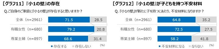 子どもが小学校に上がった際、保育園や幼稚園に通っていた時よりも仕事と育児の両立がしにくくなることが『小1の壁』と呼ばれ、社会問題となっています。そこで、全ての調査対象者に自身の家庭には『小1の壁』が存在するか、子どもがいない人には将来発生すると思うか回答してもらいました。すると、71.5%が「『小1の壁』が存在する」と回答しました。自身が正規雇用・経営者・役員などの有職女性では、79.2%とさらに高くなっています[グラフ11]。また、『小1の壁』が子どもを持つにあたり不安材料になるかと聞くと、64.8%が「不安材料になる」と回答し、有職女性では72.5%と不安度がさらに高くなっています[グラフ12]。