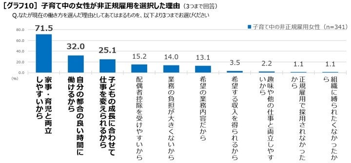 現在、非正規雇用で働いている子育て中の女性に現在の働き方を選んだ理由について聞きました。その結果、「家事・育児と両立しやすいから」(71.5%)がトップとなり、「自分の都度の良い時間に働けるから」(32.0%)、「子どもの成長に合わせて仕事を変えられるから」(25.1%)と続きました。一方、「希望の業務内容だったから」(13.1%)、「希望する収入を得られるから」(3.5%)と回答した人の割合は低く、非正規雇用で働いている多くの女性が、希望する業務内容や収入よりも、育児との両立を実現させること優先させていることが分かりました[グラフ10]。