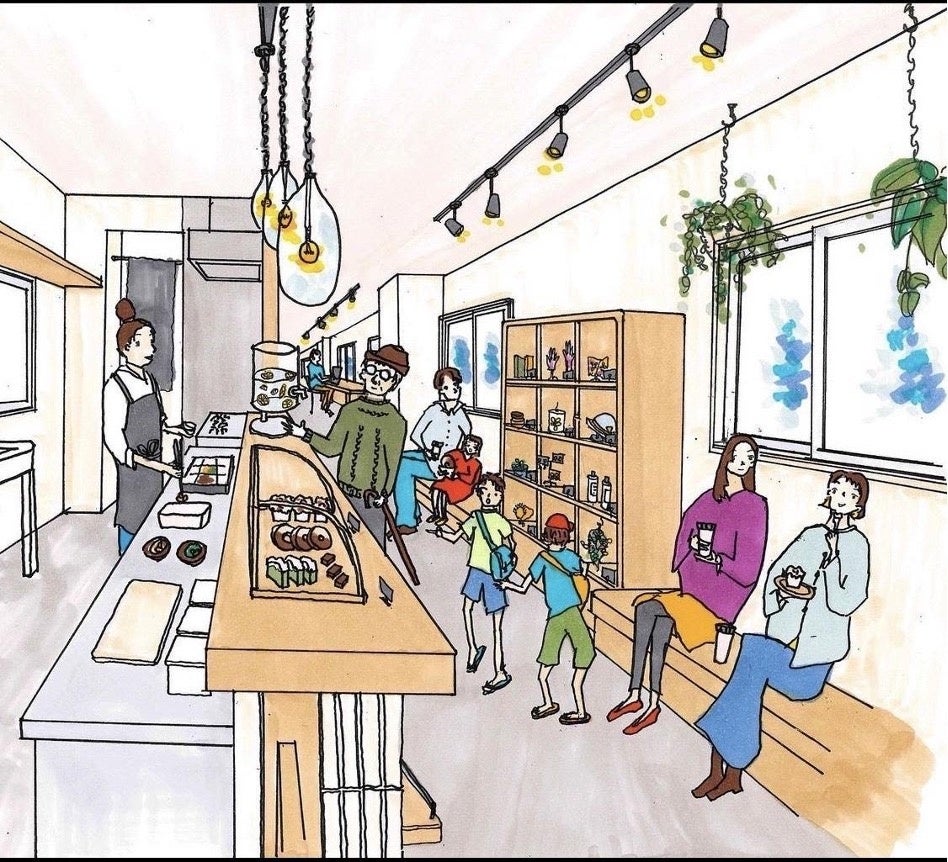 ローカルアーティストの作品や雑貨の展示販売を楽しみながら一息つけるカフェスペース。地元の人も、まちの新しい魅力に日々気づけるような、商店街のおすすめ商品を集め、購入できる「シェア棚」を設置します。