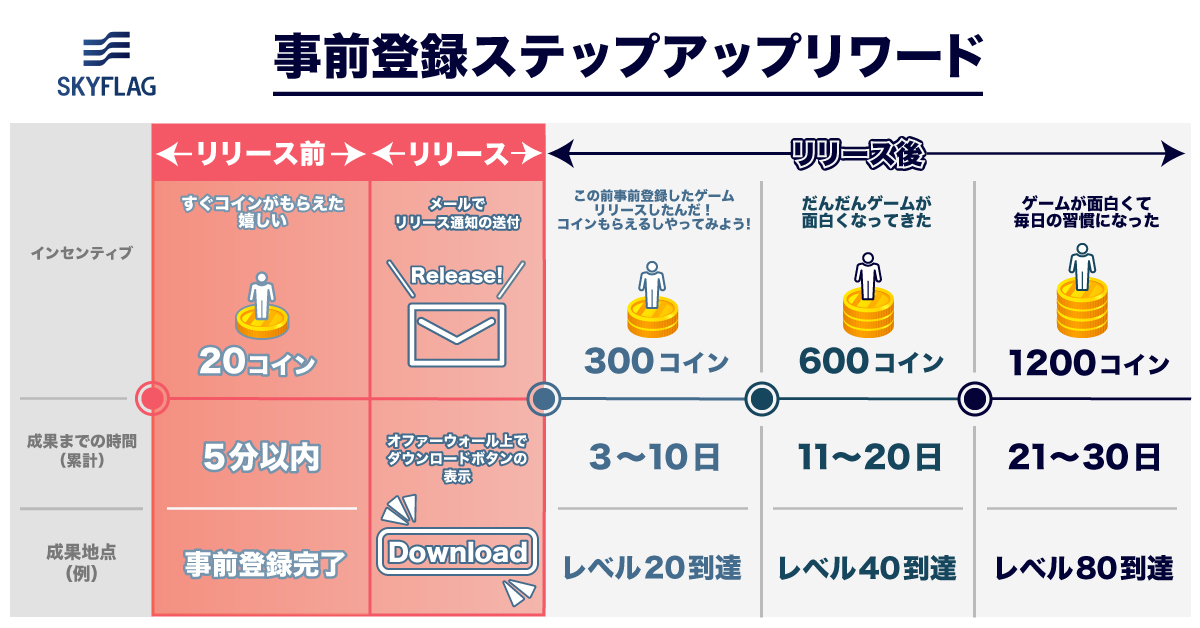 スマートフォンアプリ、Webサービス向けのロングCPEリワード配信に特化したアドネットワーク「SKYFLAG」を開発・運営する株式会社Skyfall(代表取締役社長:長谷川 智一、以下Skyfall)は、SKYFLAGの新機能として「事前登録ステップアップリワード(略称:事前登録SUR)」をリリースしたことをお知らせいたします。