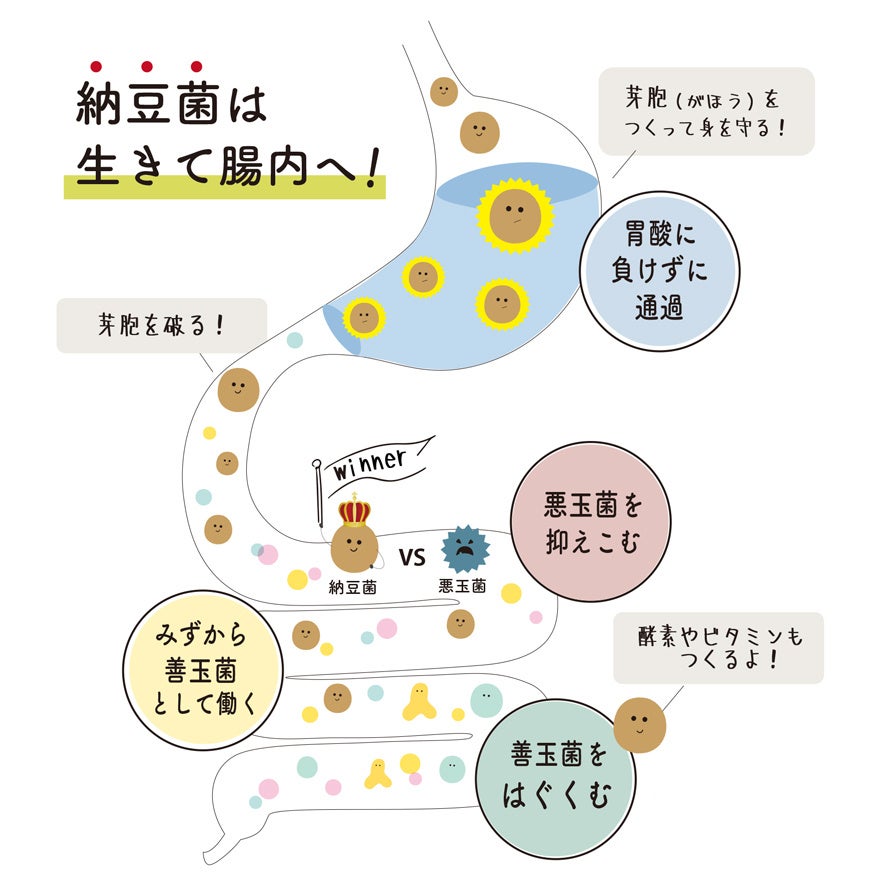 腸内に届いた納豆菌は、悪玉菌の増加を抑えたり、自らが善玉菌として働いたり、酵素やビタミンを産生します。さらに、乳酸菌やビフィズス菌とも相性が良く、他の善玉菌の増殖を助けてくれます。納豆菌は、”善玉菌の育菌係”として働くことで、腸内細菌バランスを整えてくれるのです。