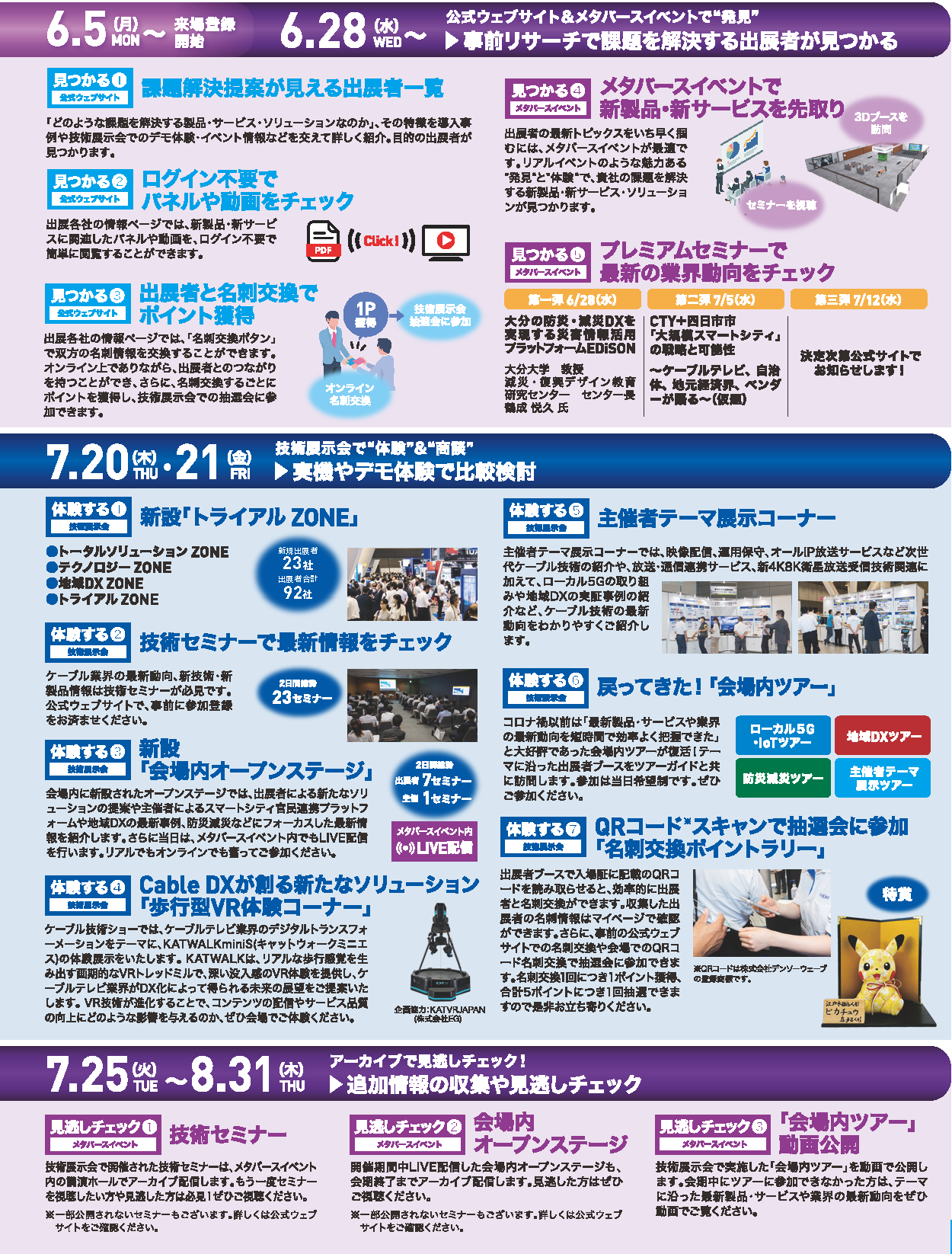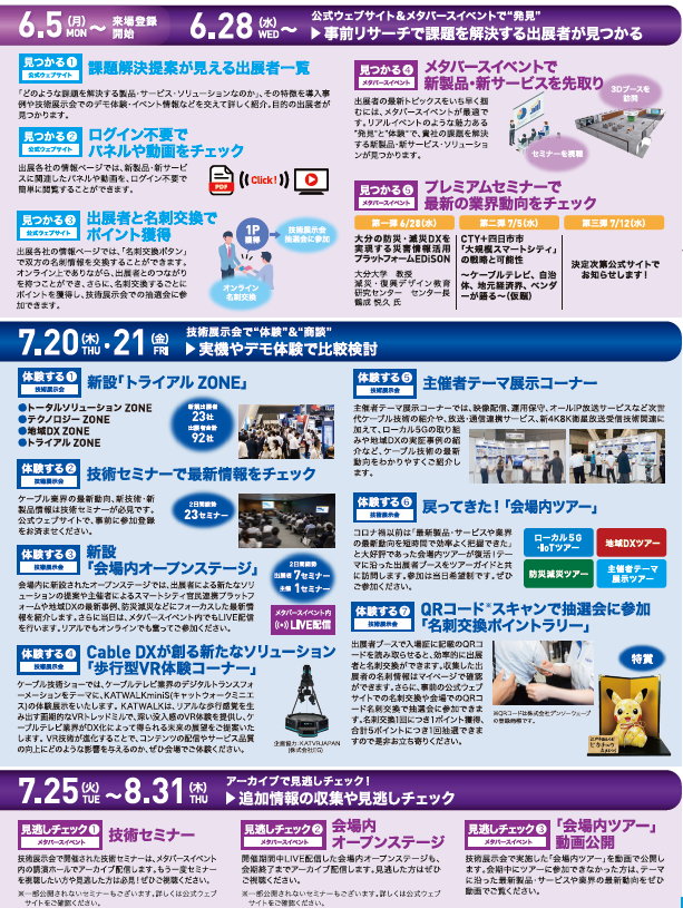 オンラインでしか来場できない方も、技術展示会前に情報収集する方も、まずはメタバースイベントにご来場いただき、今年度のケーブル技術ショーの最新トピックスや新製品・新サービス情報をご覧ください。