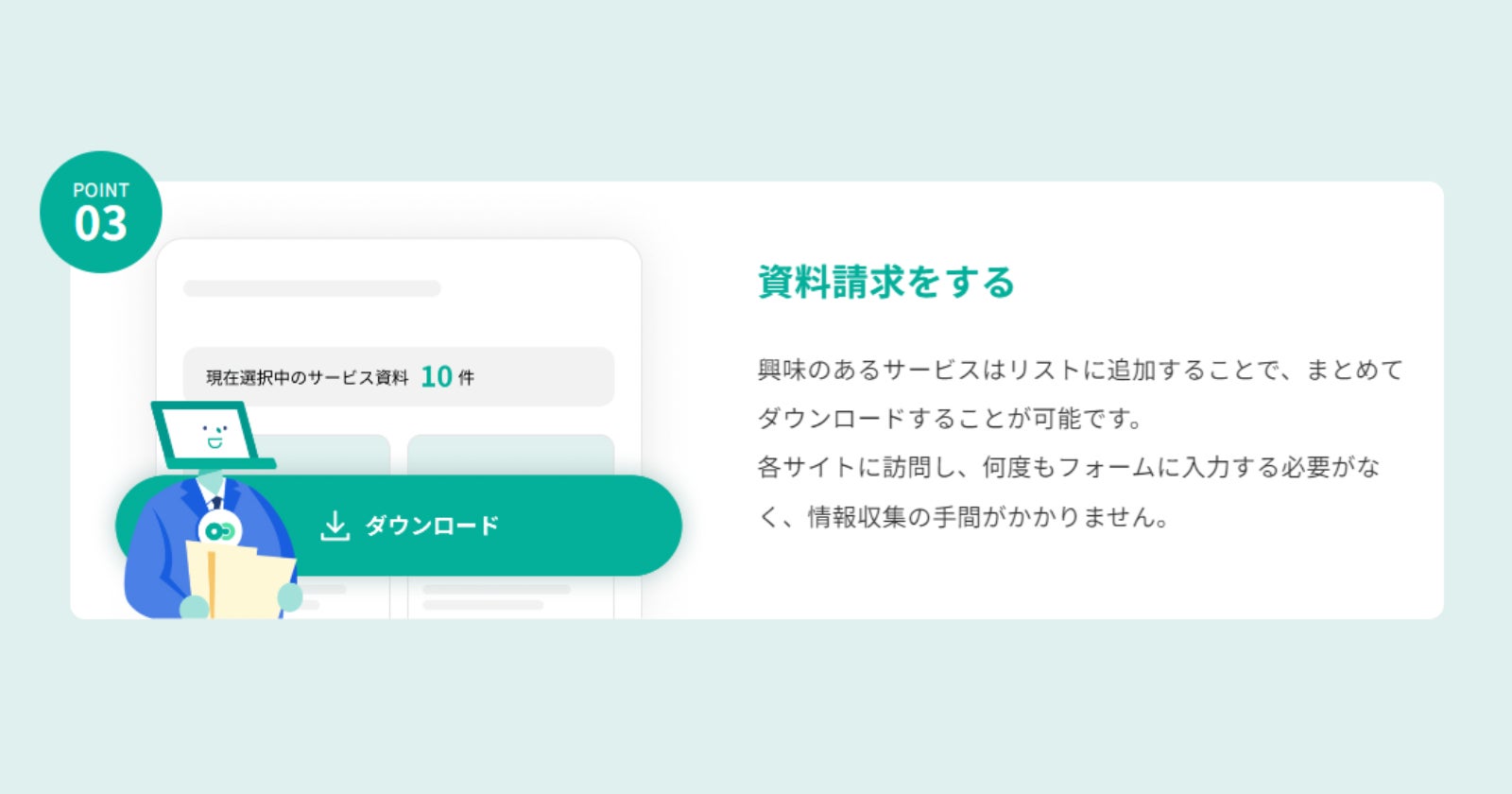 興味のあるサービスはリストに追加することで、まとめてダウンロードすることが可能です。各サイトに訪問し、何度もフォームに入力する必要がなく、情報収集の手間がかかりません。